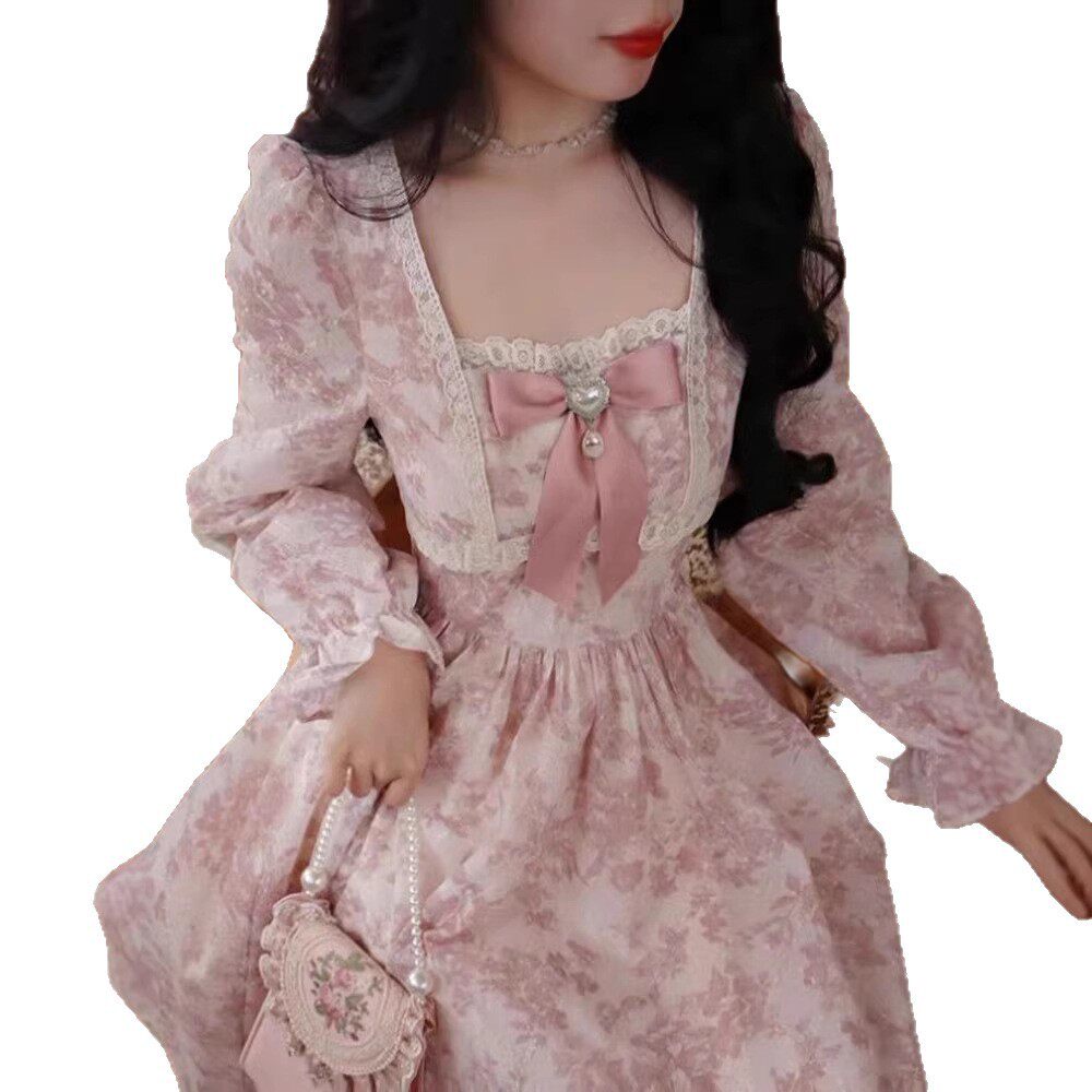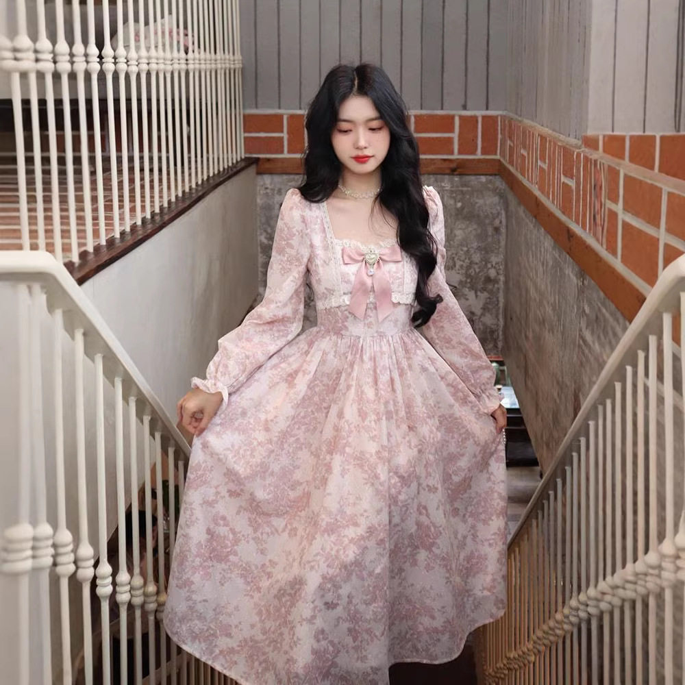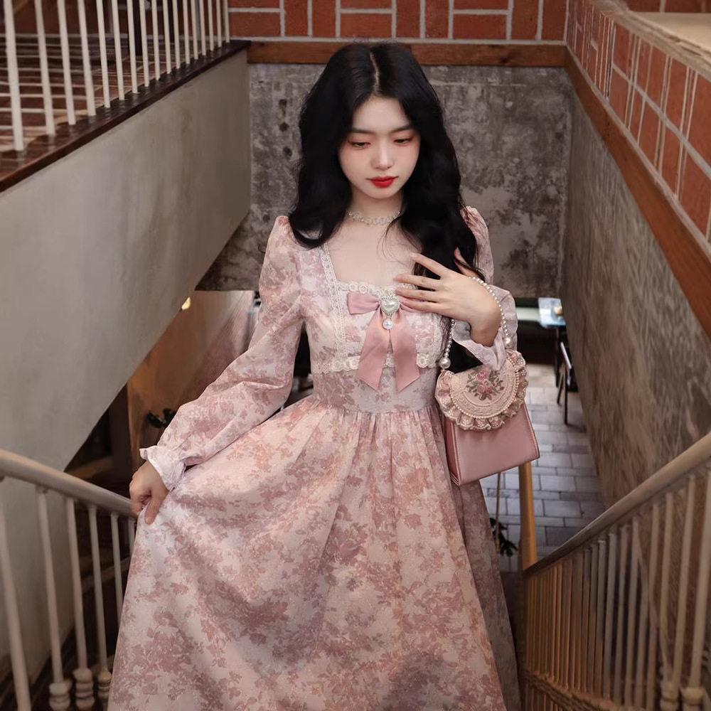 法式甜美碎花长袖连衣裙气质长裙收腰温柔风仙女春秋季裙子