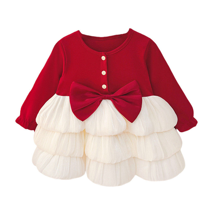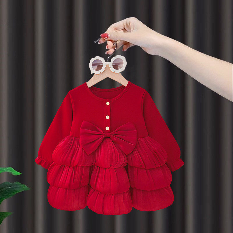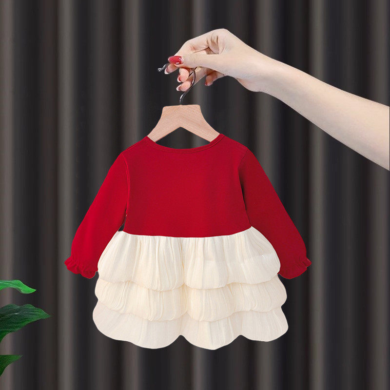 女宝宝公主风红色长袖连衣裙女童韩版洋气蛋糕裙周岁礼服春秋新款
