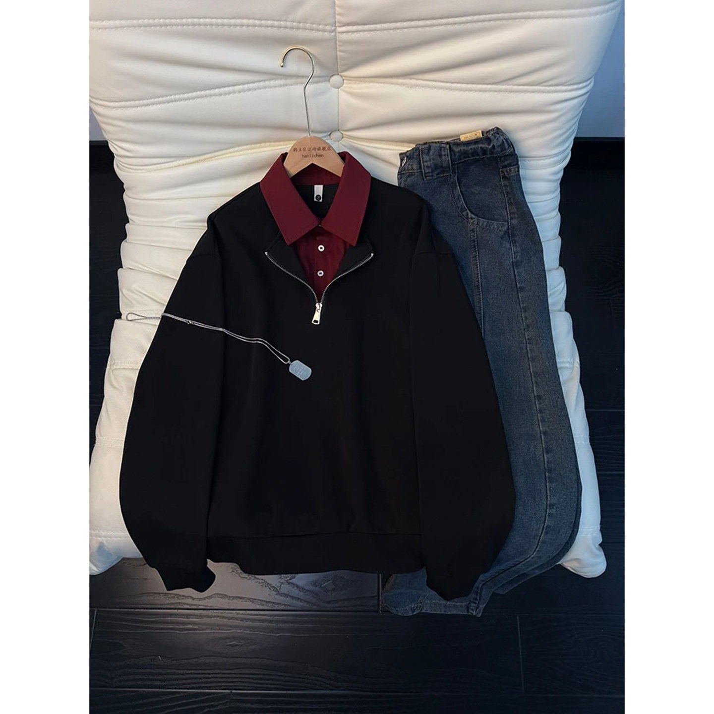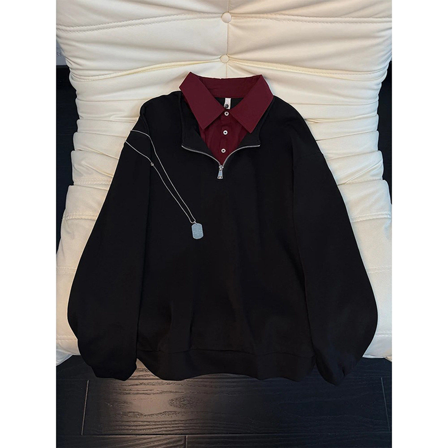 美式假两件衬衫领卫衣男款春秋重磅拼接长袖t恤半拉链老钱风外套
