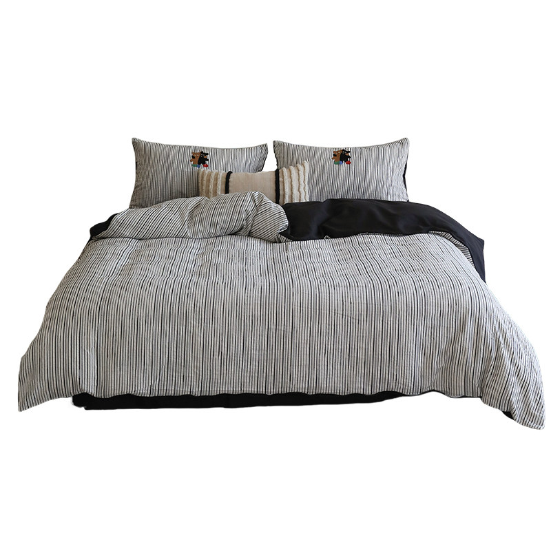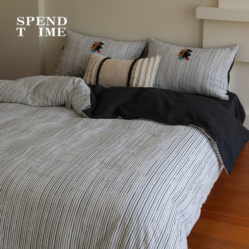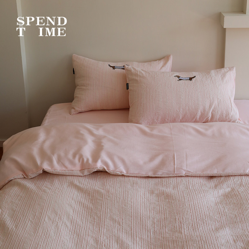 花时间生活春夏卡通刺绣条纹床单被套水洗全棉双层纱床上四件套