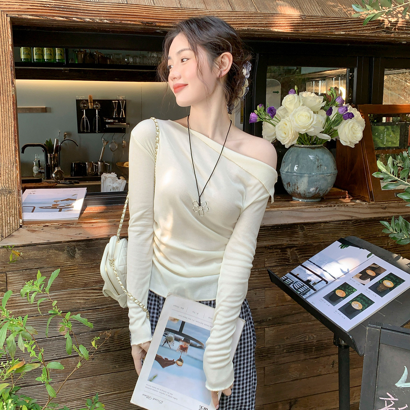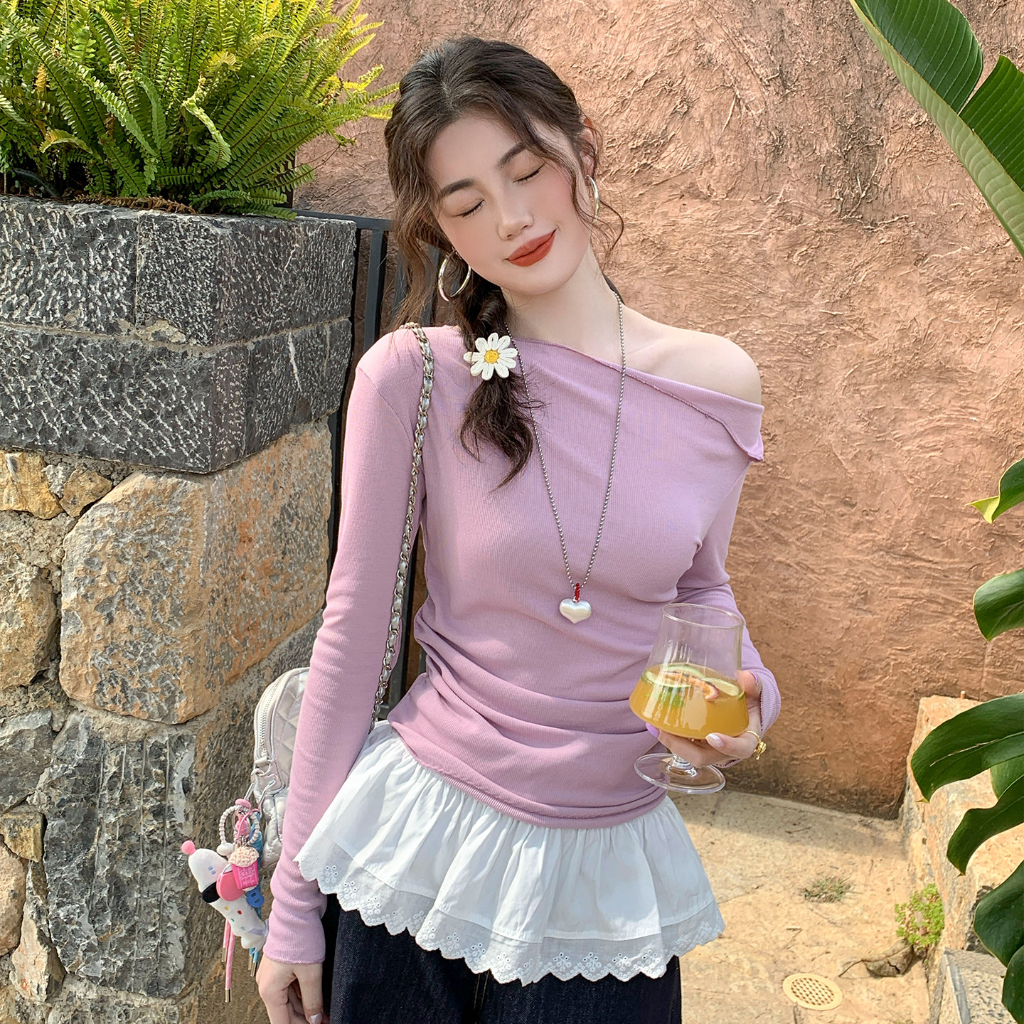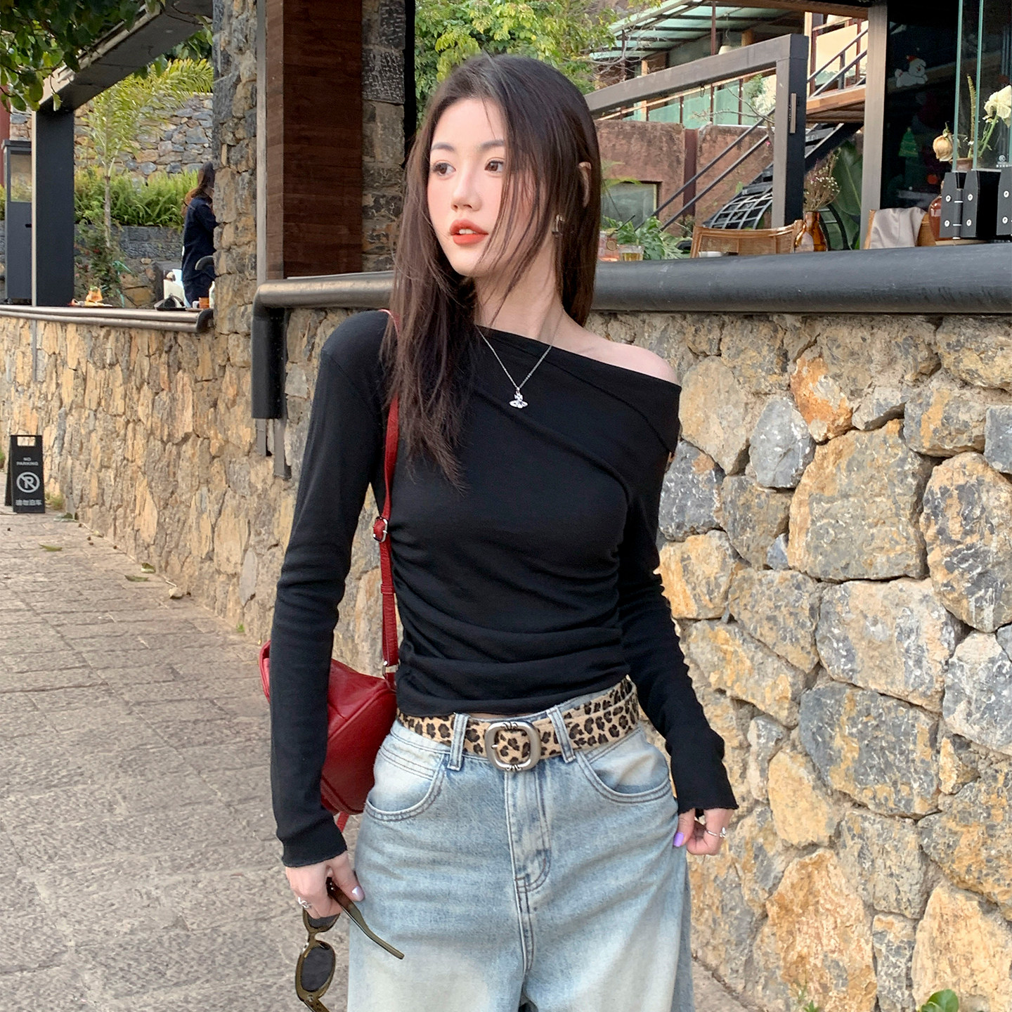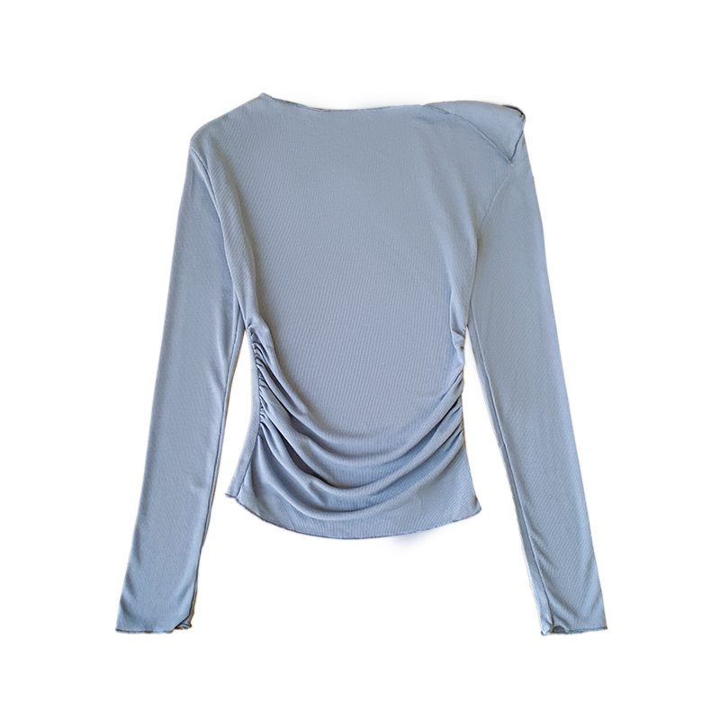 龙妹家蓝色斜肩长袖T恤女外穿2026新款早春漂亮独特掐腰修身上衣