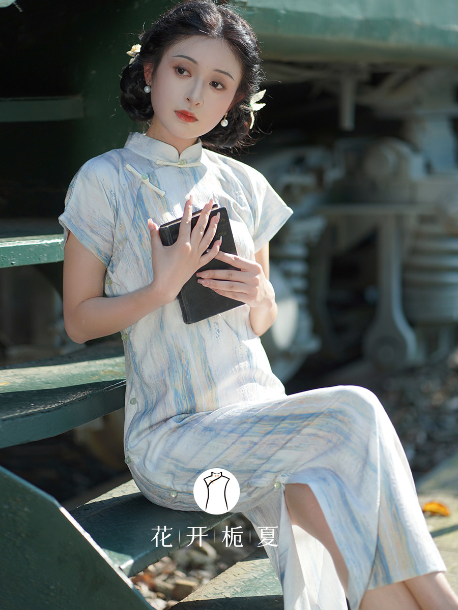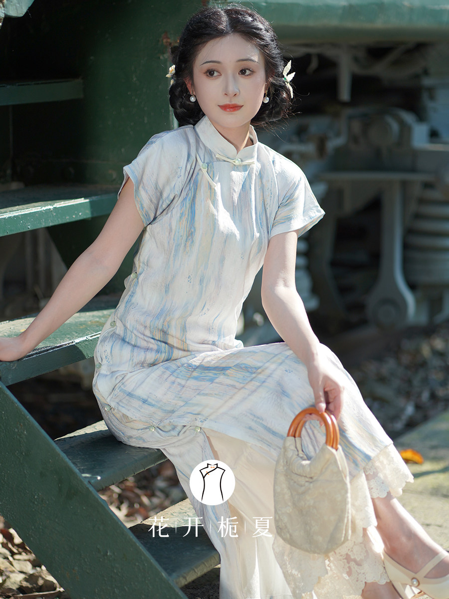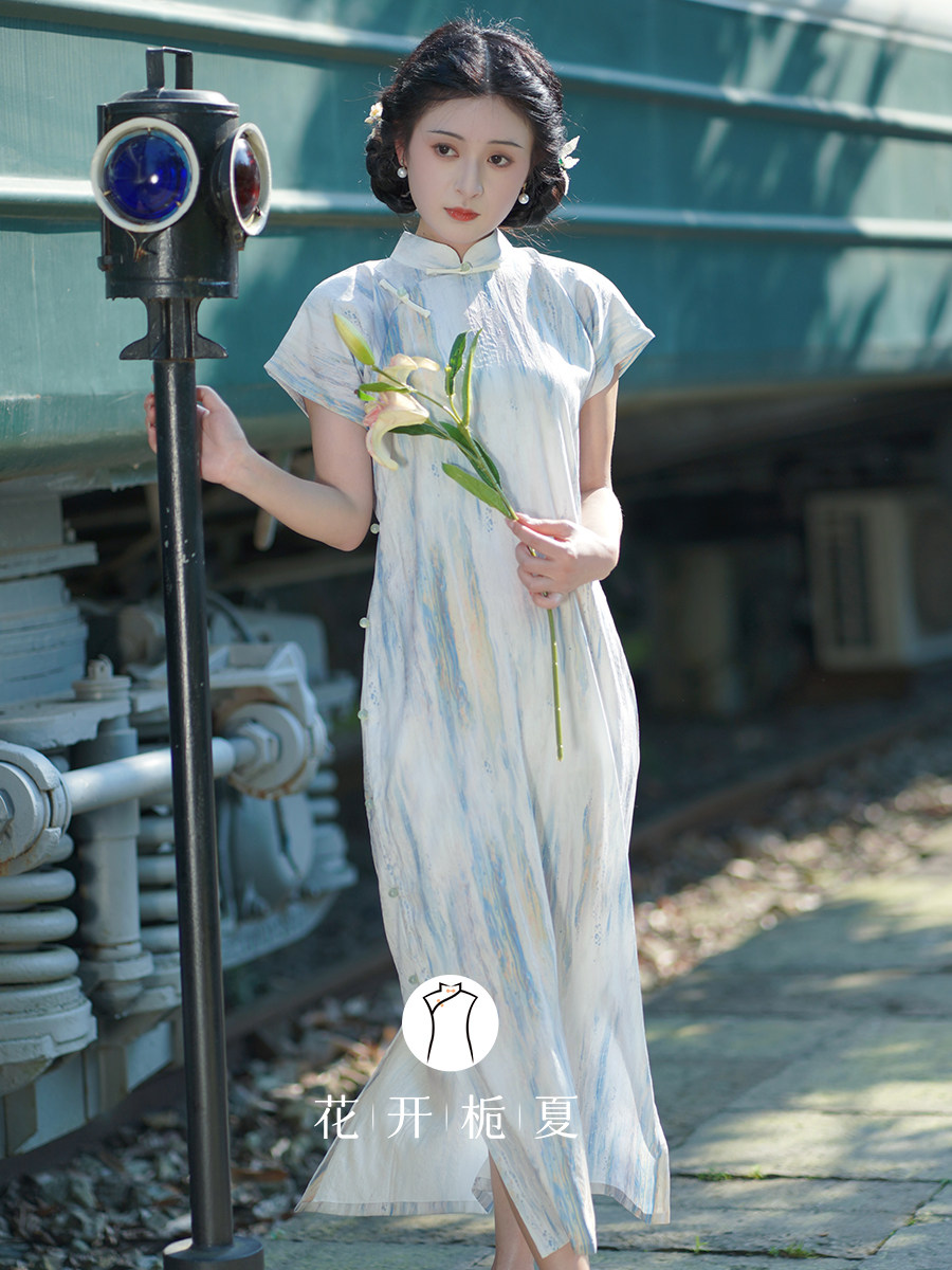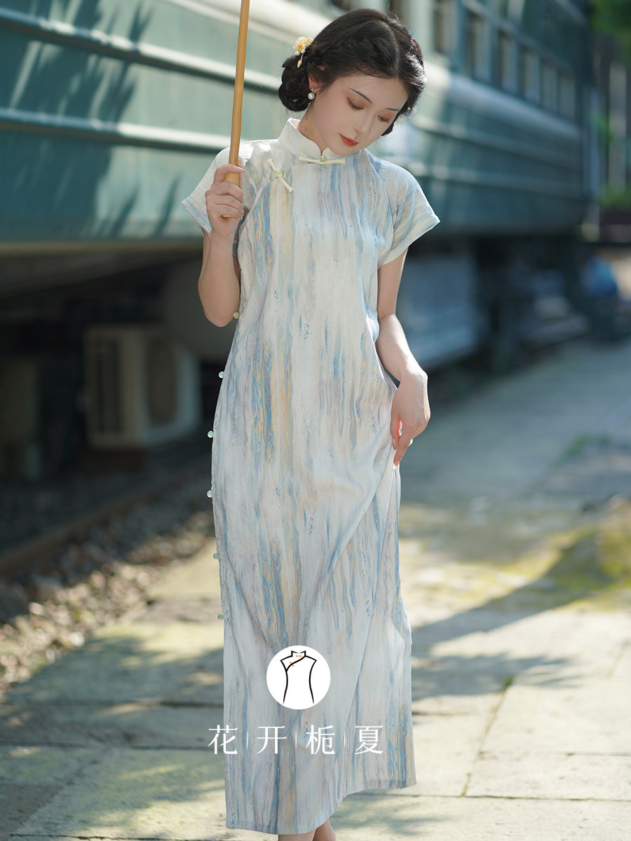 《蓝川》 古法全开襟少女旗袍2026夏季新款文艺复古长款连衣裙