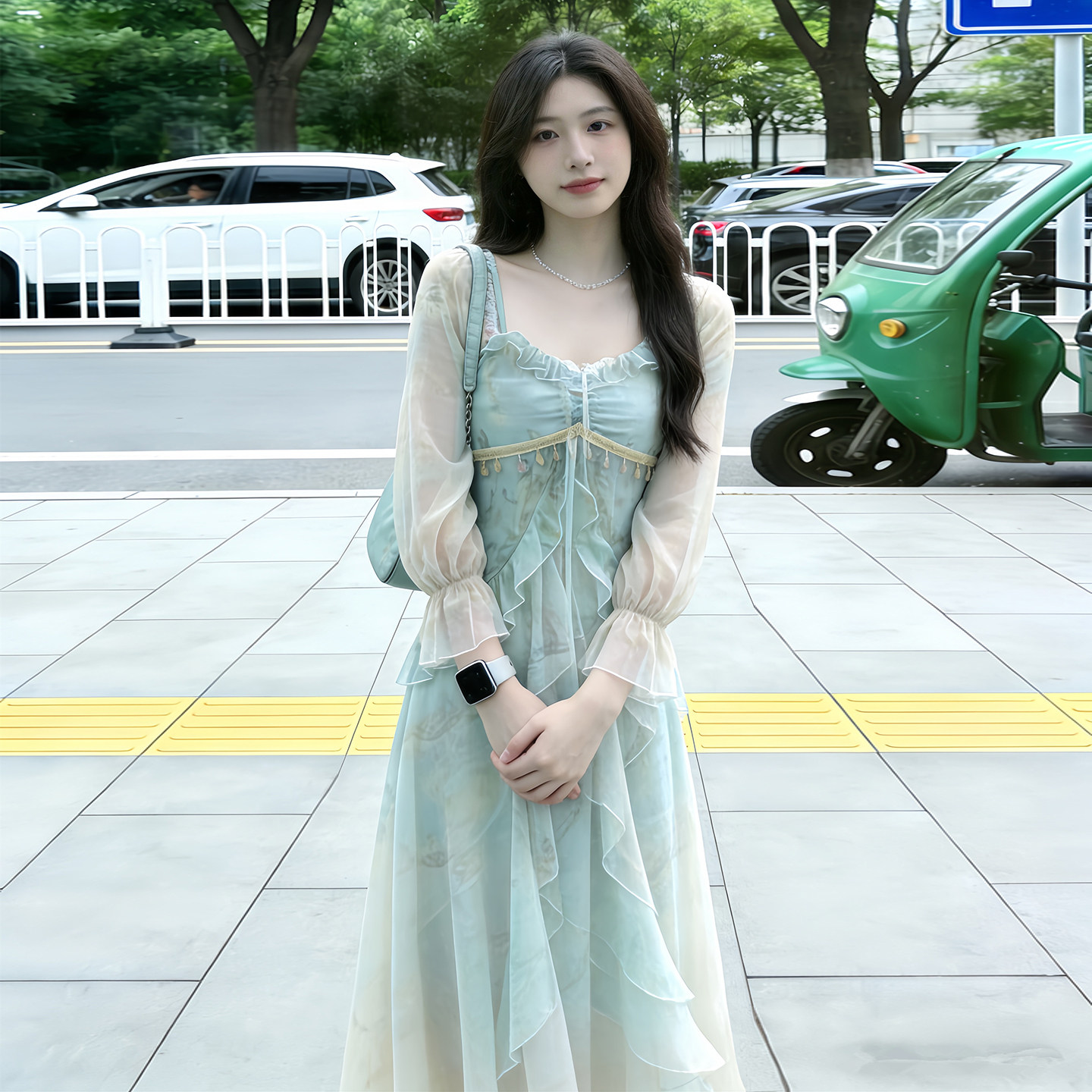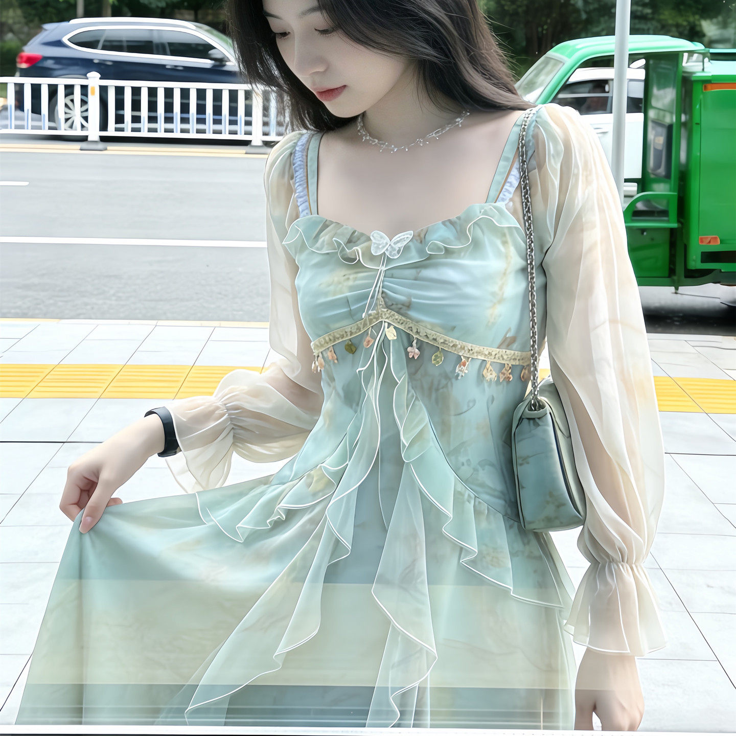 【流岚织梦】法式小众荷叶边雪纺连衣裙女长袖2026春夏季新款长裙