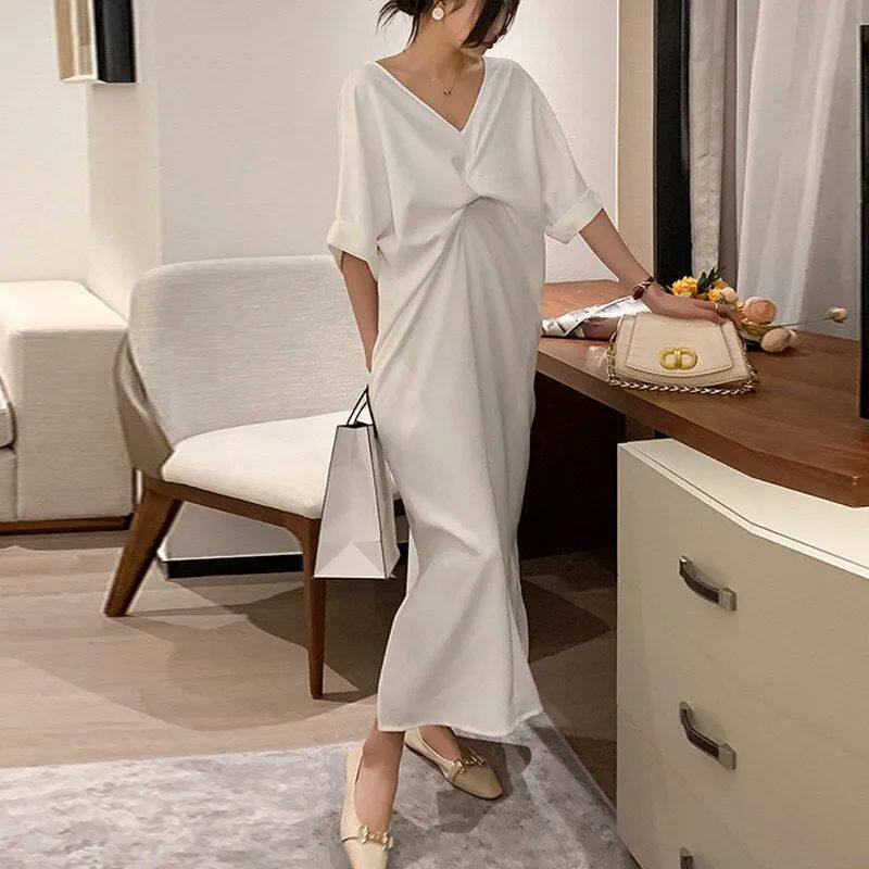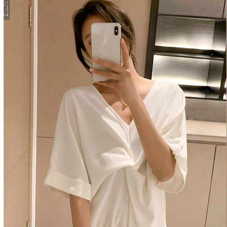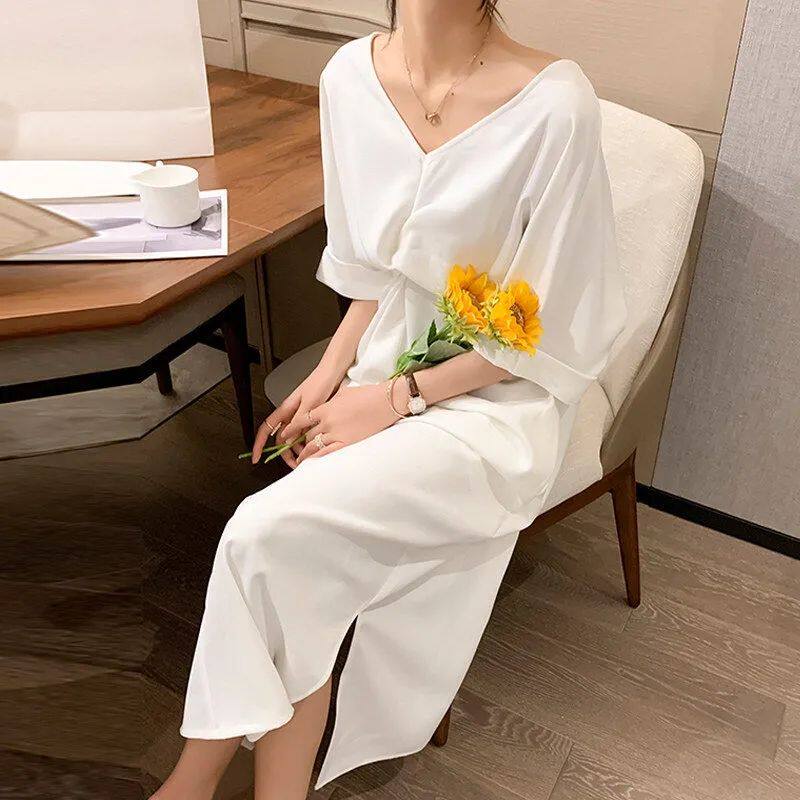 大码300斤扭结过膝短袖T恤裙女夏季新款胖MM宽松遮肚子显瘦连衣裙