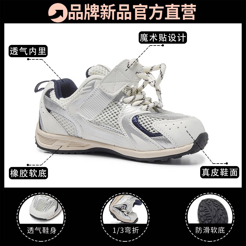 儿童真皮老爹鞋夏季2026新款网面透气男童运动鞋轻便女童白色网鞋