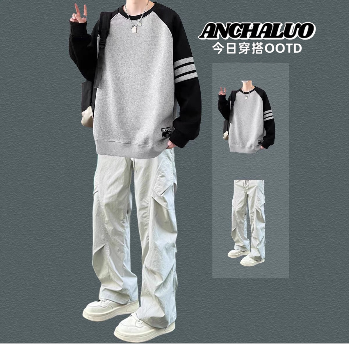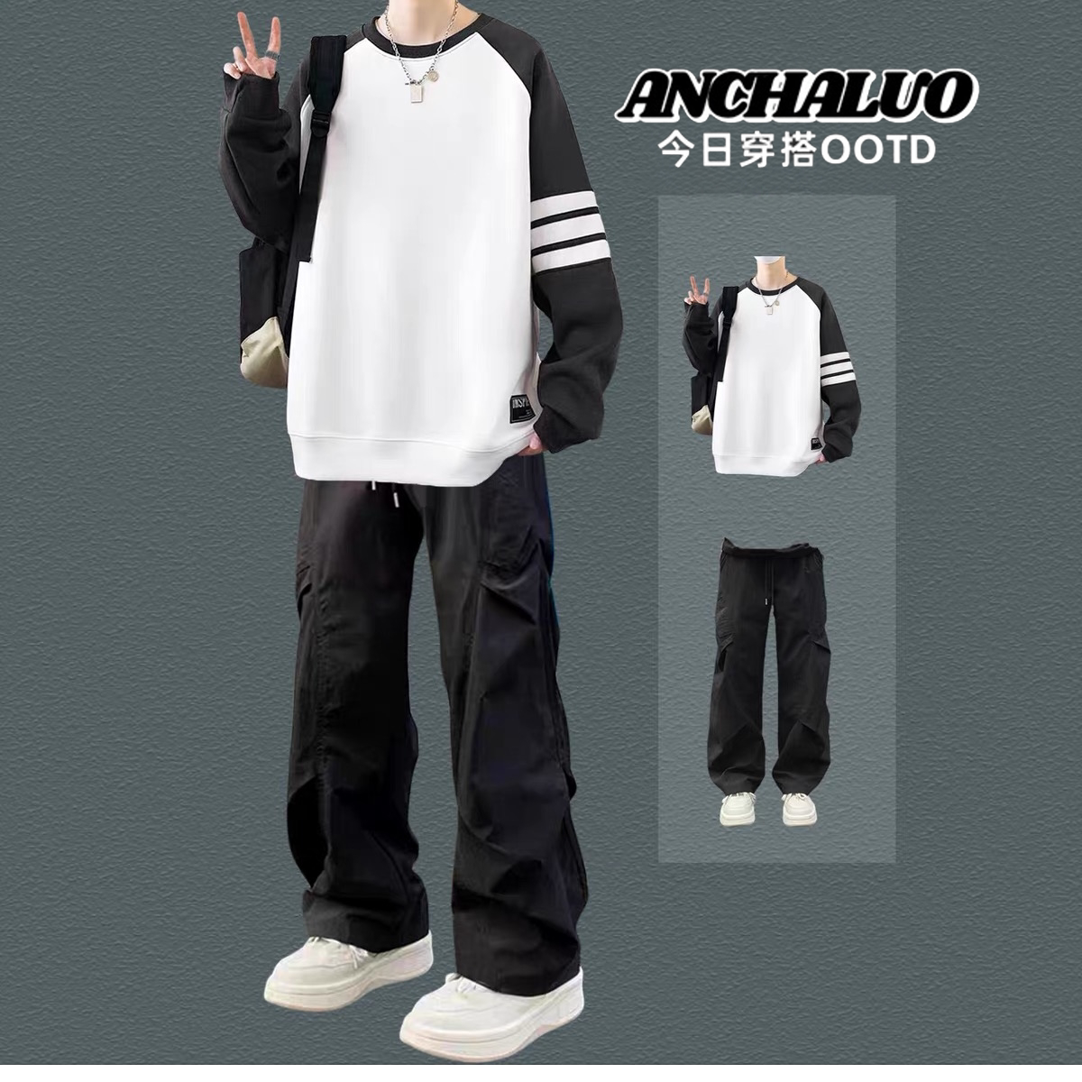 港风潮流拼色男女款卫衣春秋新款长袖t恤男生青少年酷帅穿搭套装