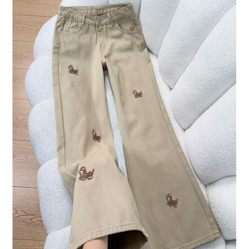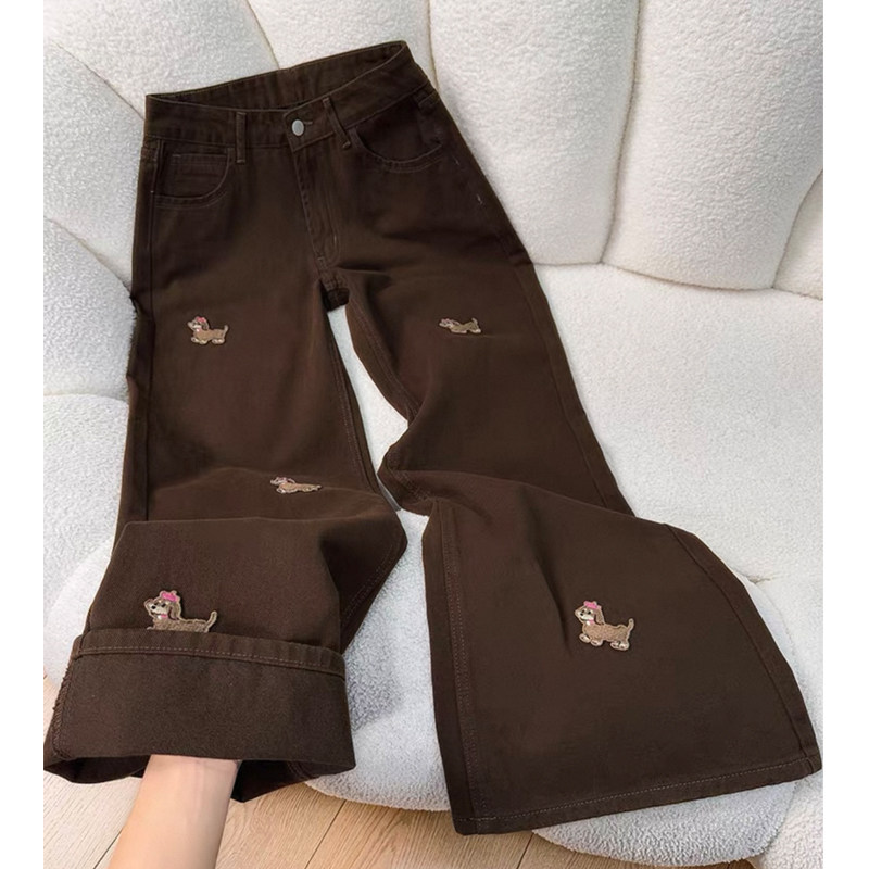 棕咖色小狗刺绣不贴腿微喇牛仔裤女2026新款夏季薄款低腰直筒裤子