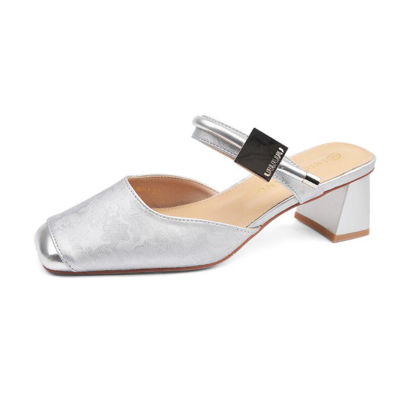 特价真皮包头半拖鞋女2025新款夏季外穿高级感配裙子粗高跟凉拖鞋