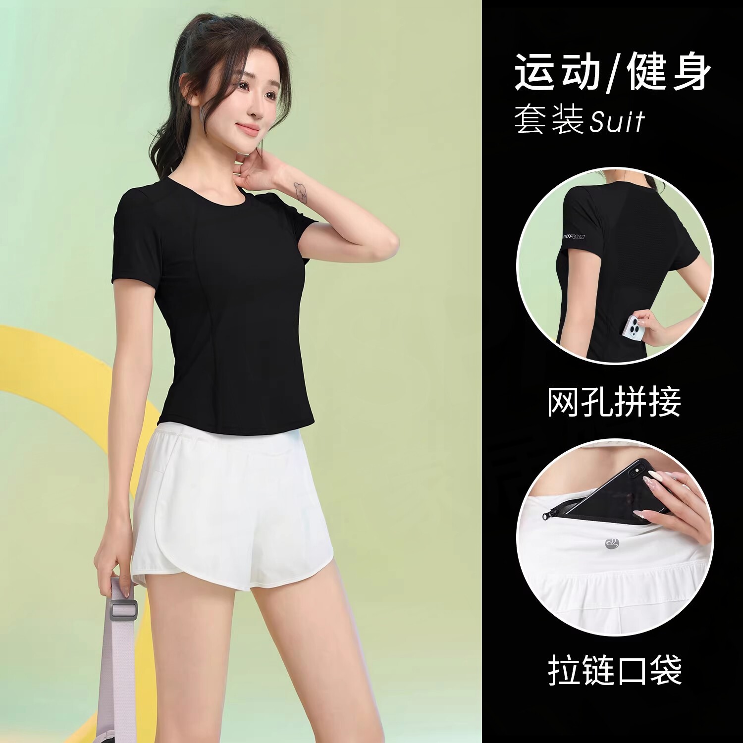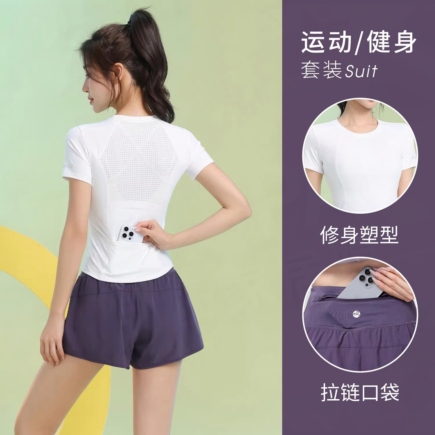 法国夏季专业马拉松跑步运动套装女健身服后口袋短袖速干衣瑜伽服