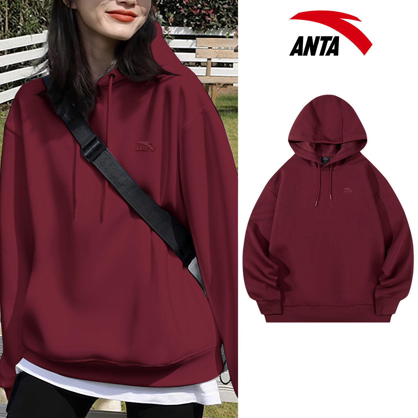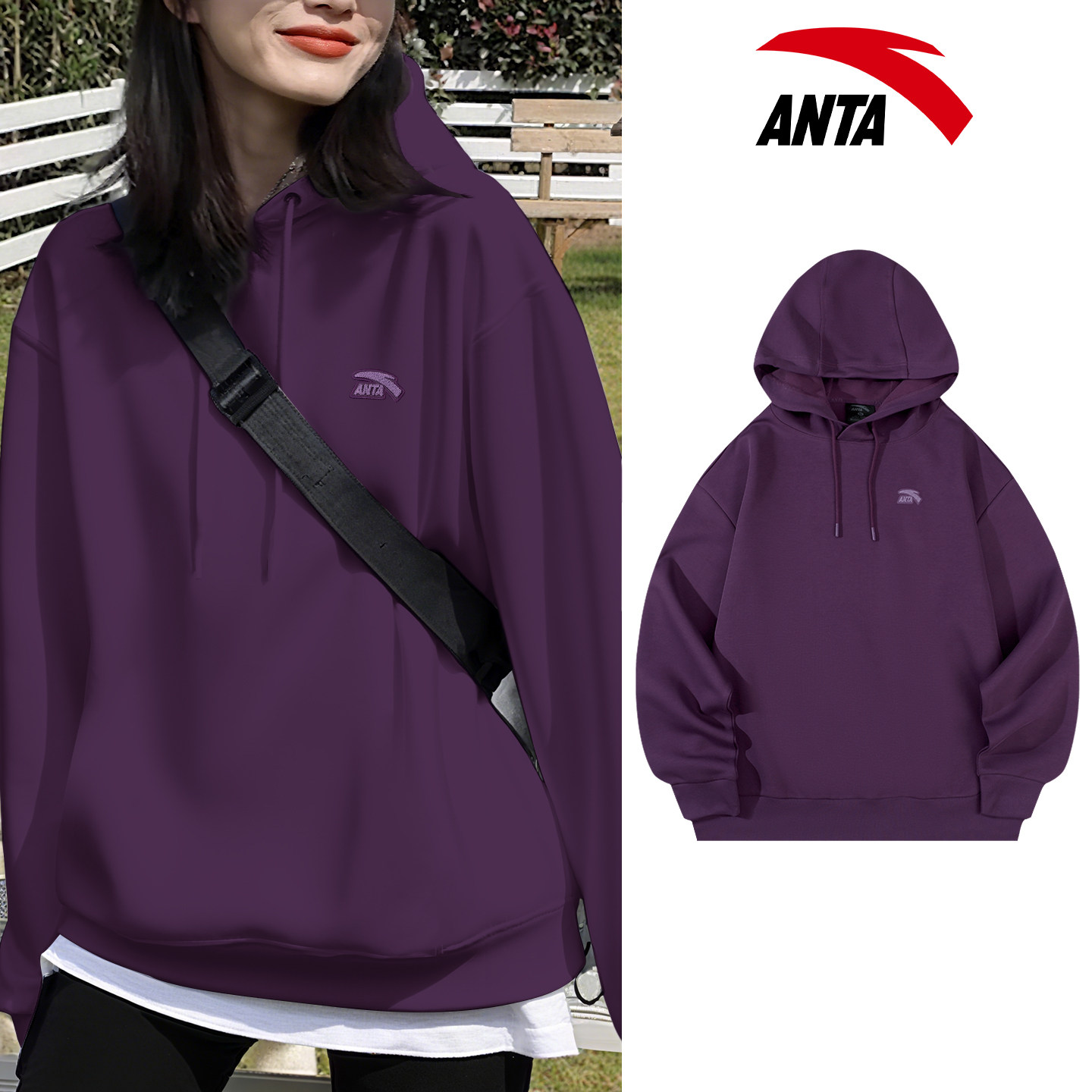 安踏紫色连帽卫衣女装休闲宽松保暖春季新款美式学生套头上衣外套
