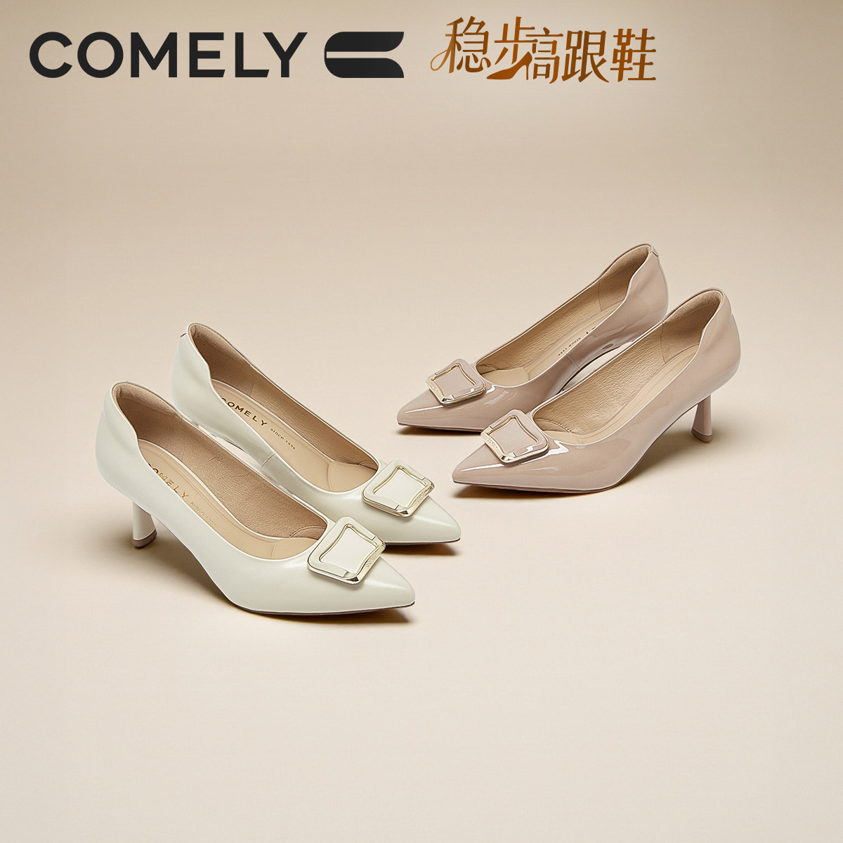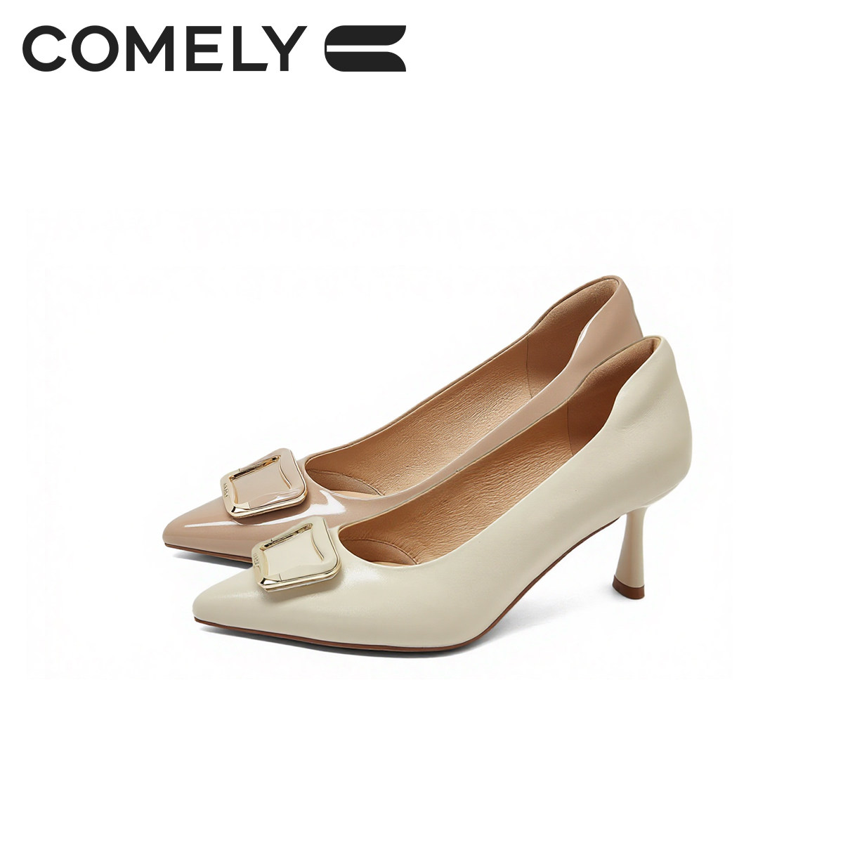康莉尖头细跟裸色高跟鞋2026春季新款真皮方扣气质通勤女鞋配裙子