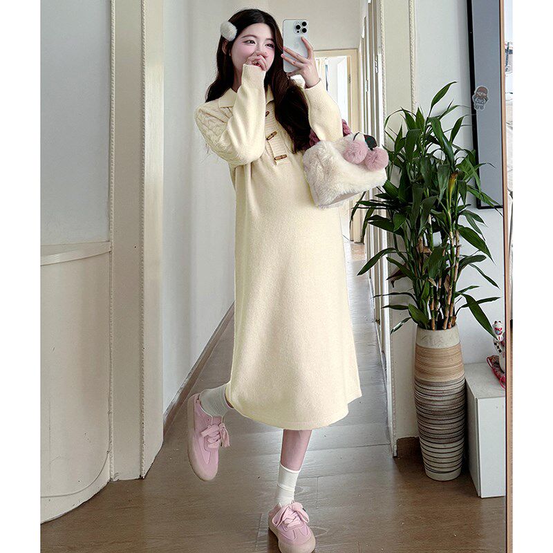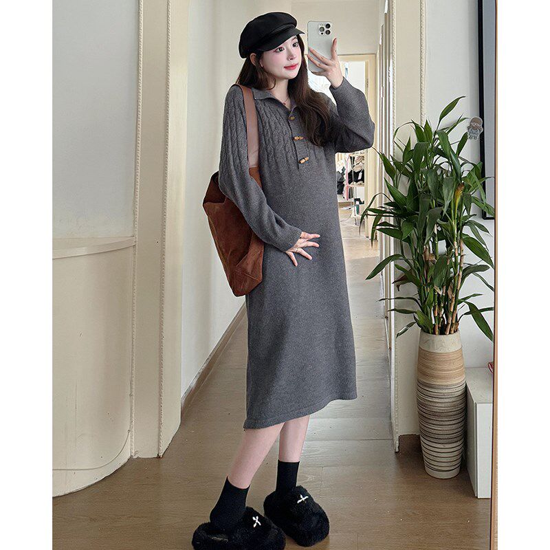 孕妇连衣裙秋冬粉色翻领麻花中x长款慵懒风2024新款内搭打底毛衣
