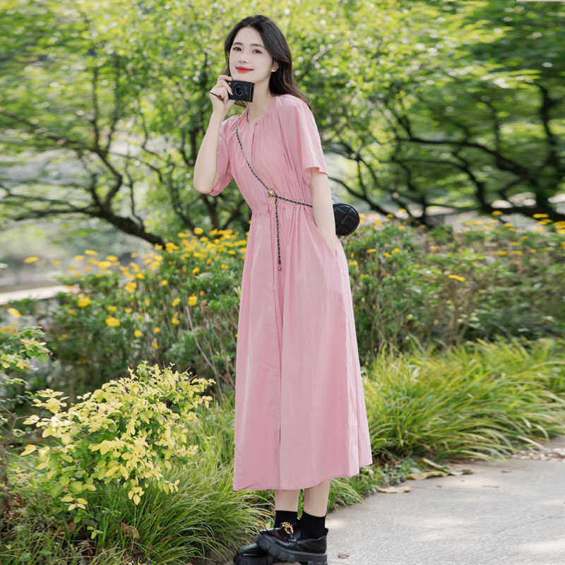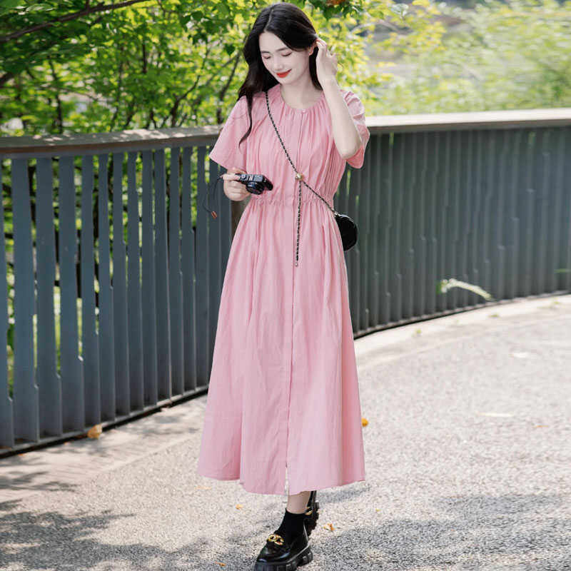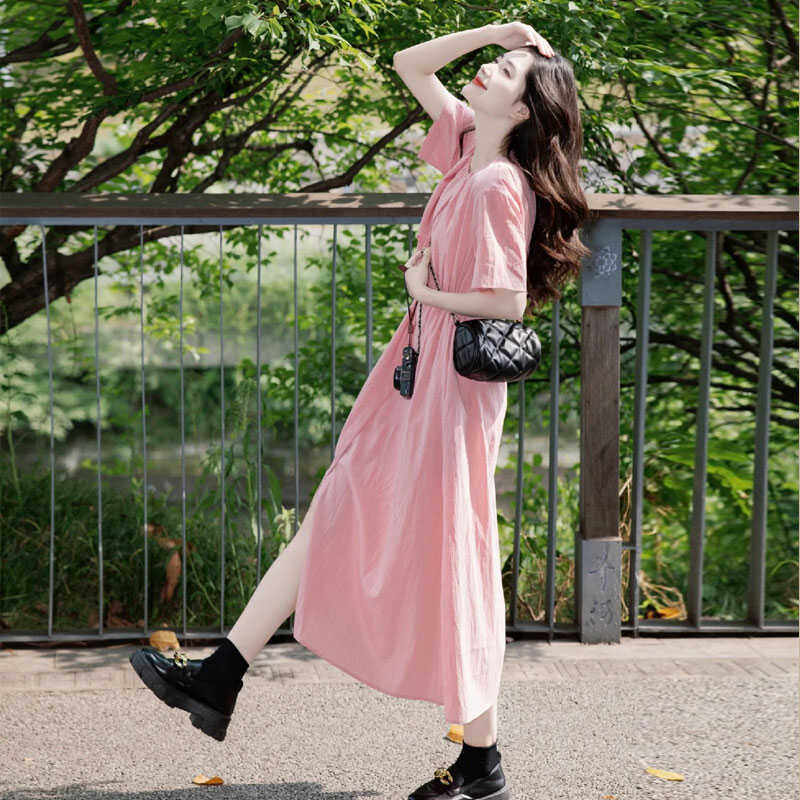 法式温柔粉色短袖衬衫连衣裙女夏季新款高级感宽松休闲慵懒风长裙
