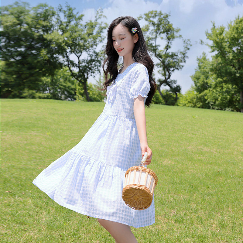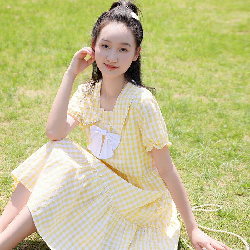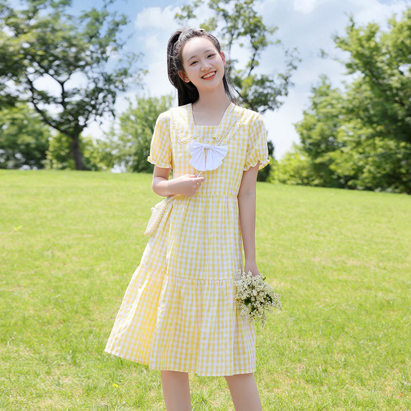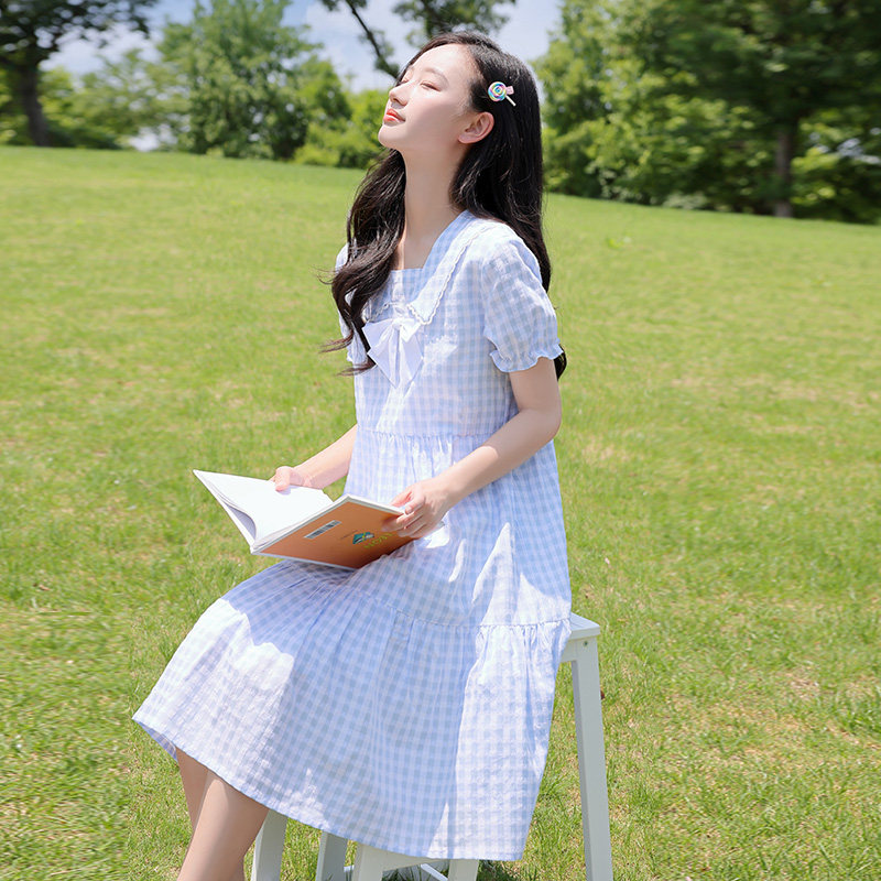 初中生连衣裙女中长款夏装森系青少年女裙高中生蝴蝶结格子连衣裙