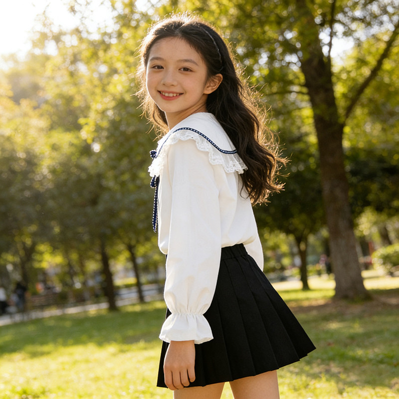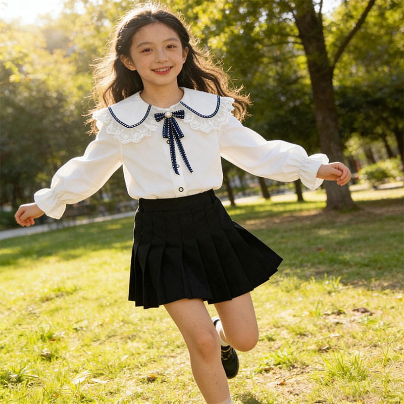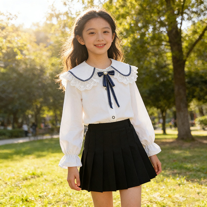 女童纯棉娃娃领长袖衬衫2026春装新款洋气大儿童公主白色上衣短裙