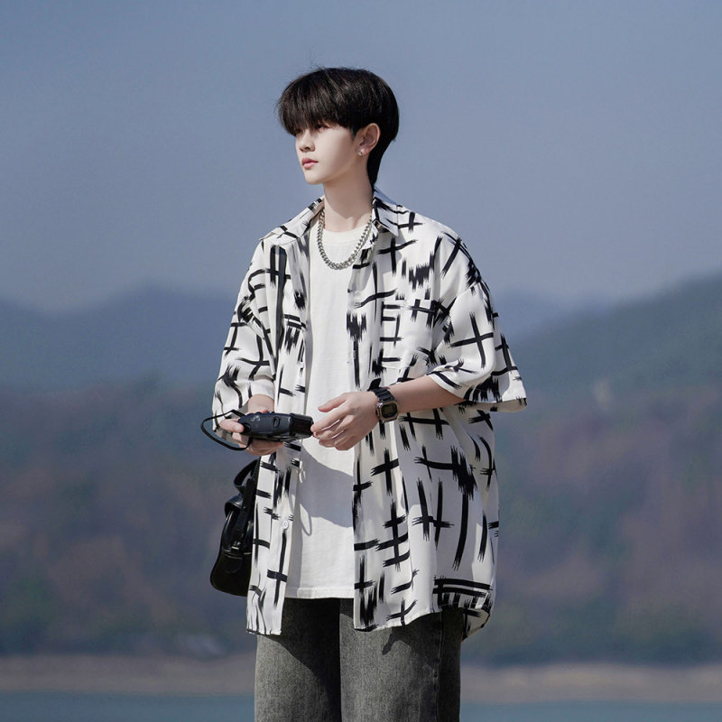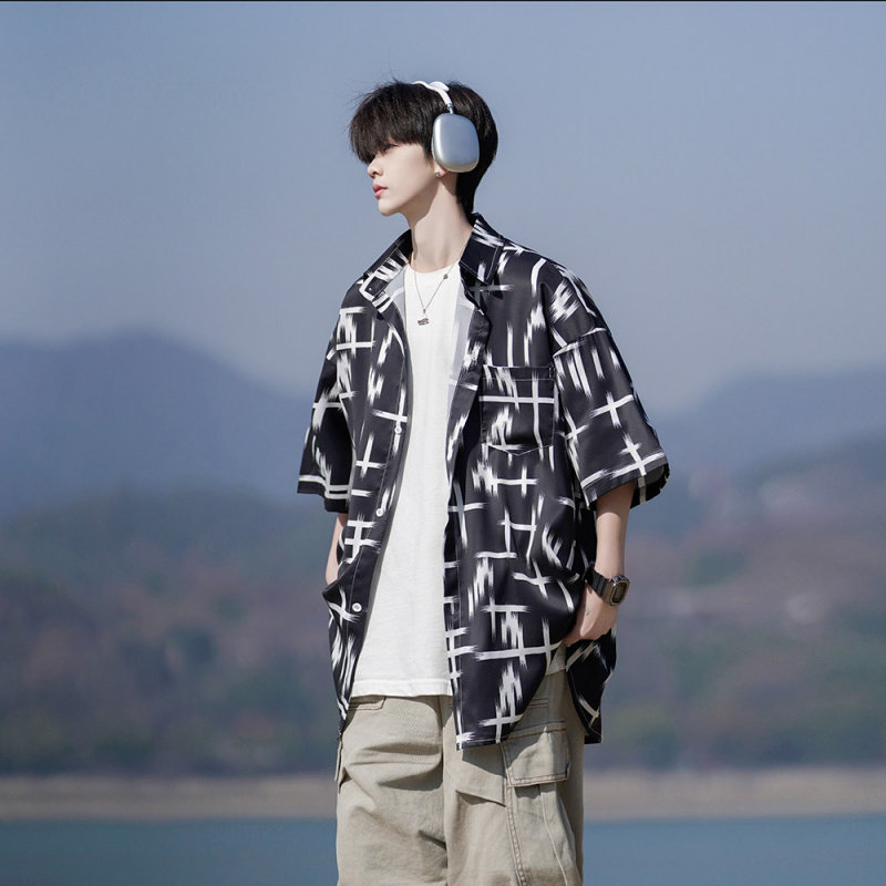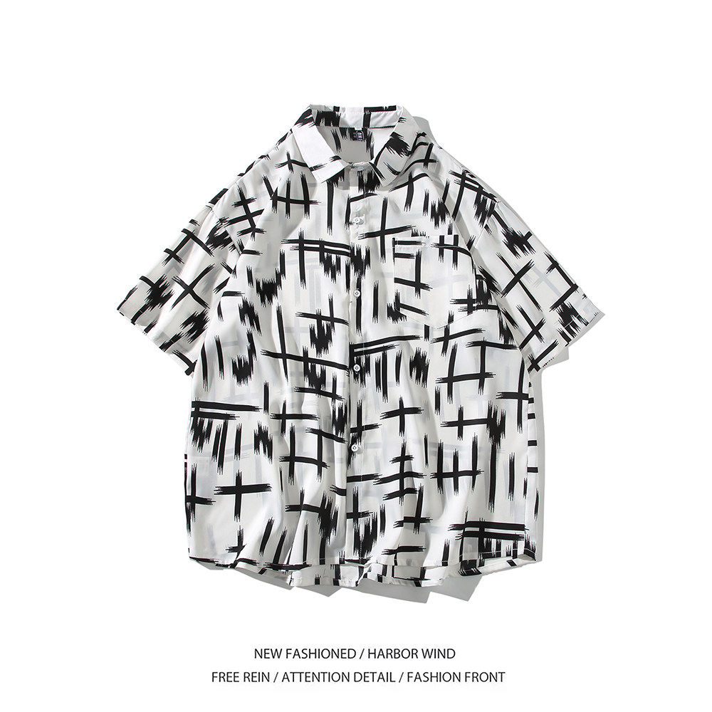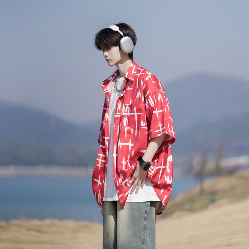 薄款冰丝花衬衫男款春季美式春威夷海滩短袖衬衣潮牌宽松休闲外套