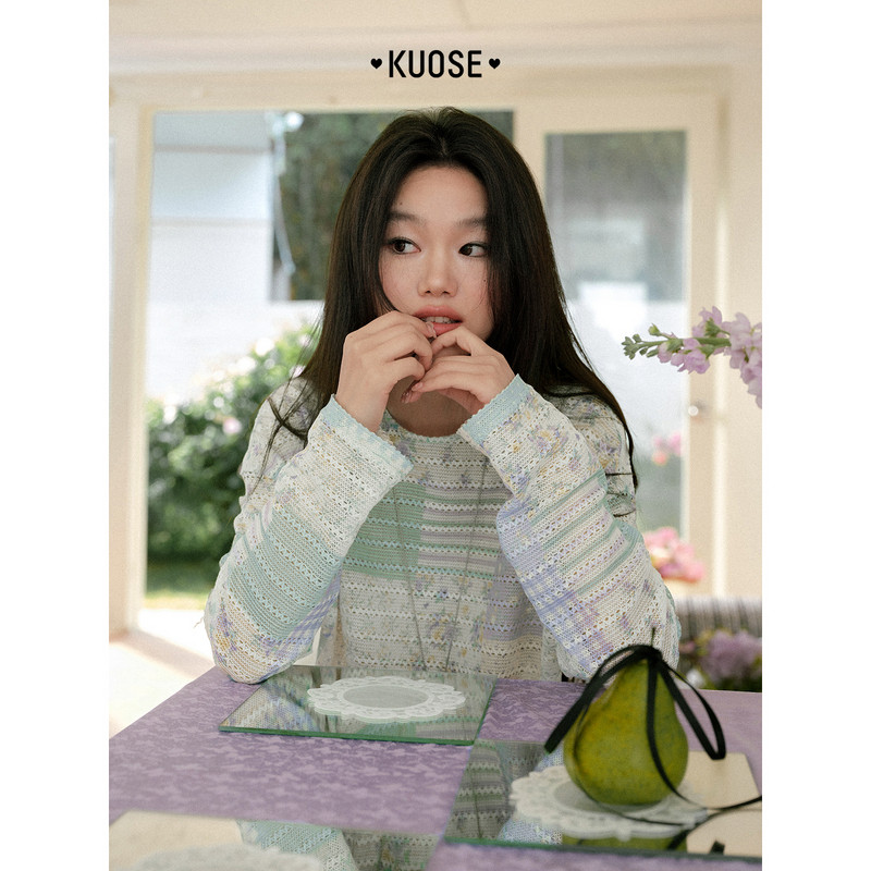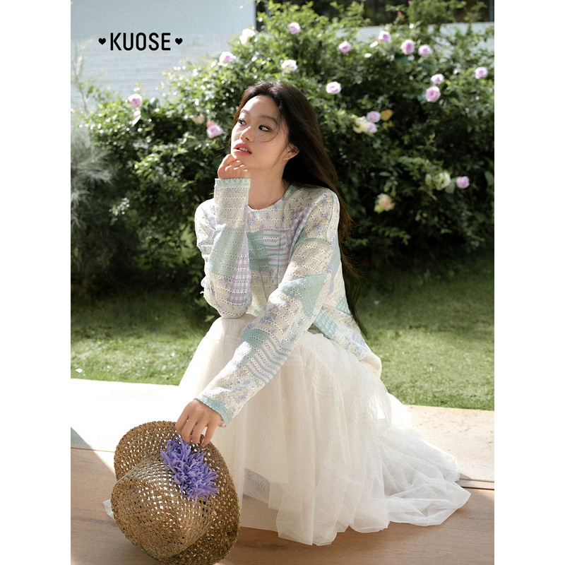 阔色设计感镂空长袖碎花t恤罩衫女2026春夏季新款圆领多巴胺上衣