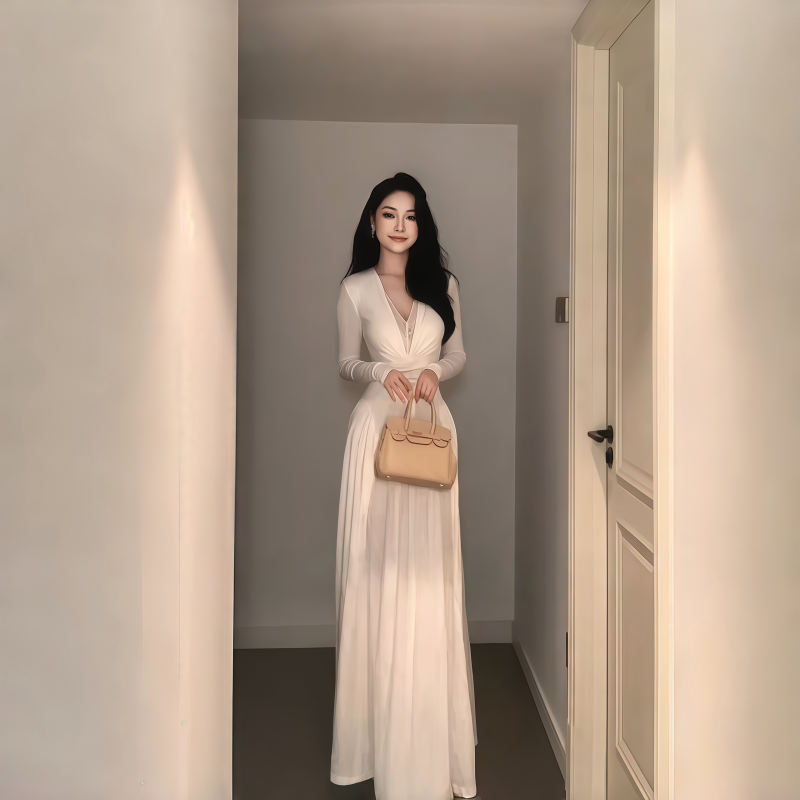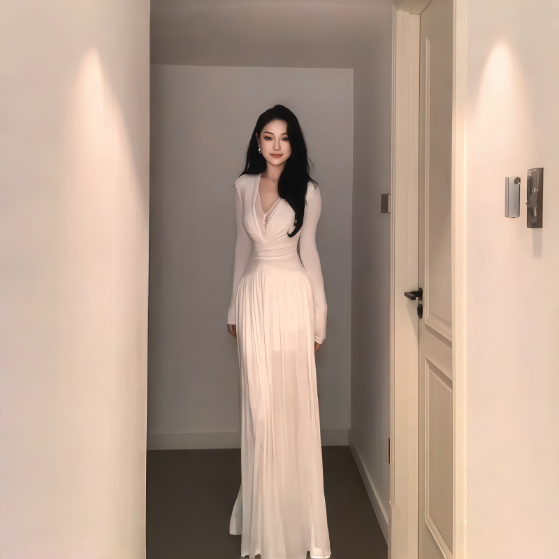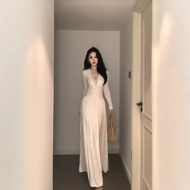 instahot 白色蕾丝拼接v领长袖连衣裙女2025新款御姐性感包臀裙