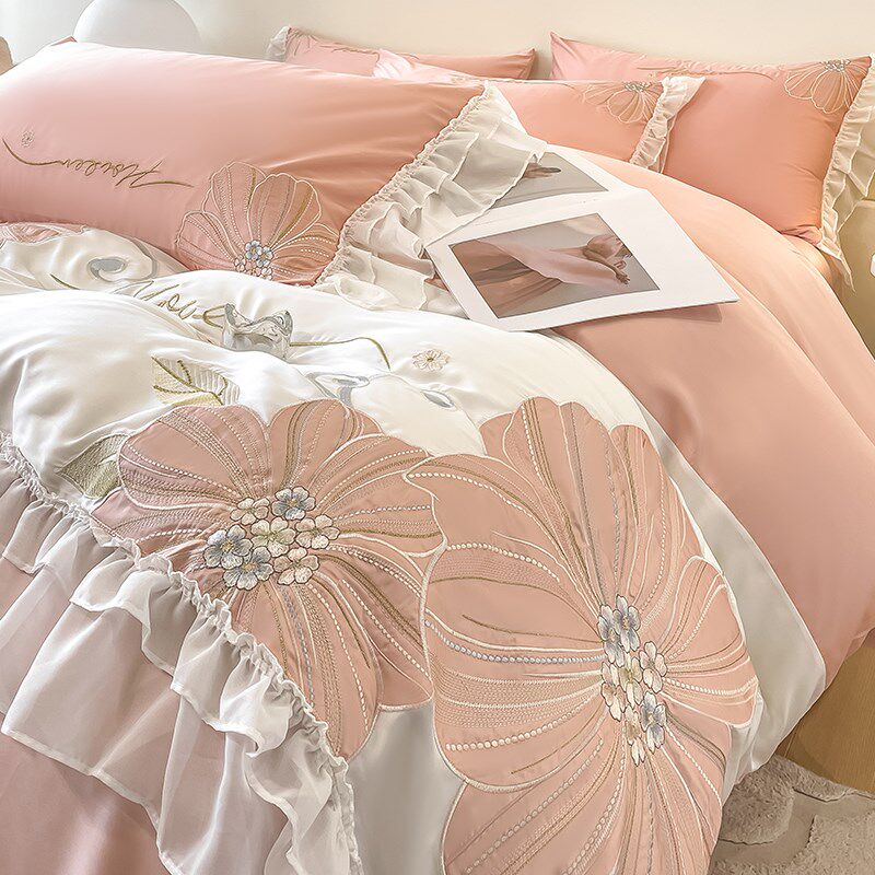 夏天公主风床上四件套o冰丝少女心蕾丝紫色被套凉感裸睡床笠款床