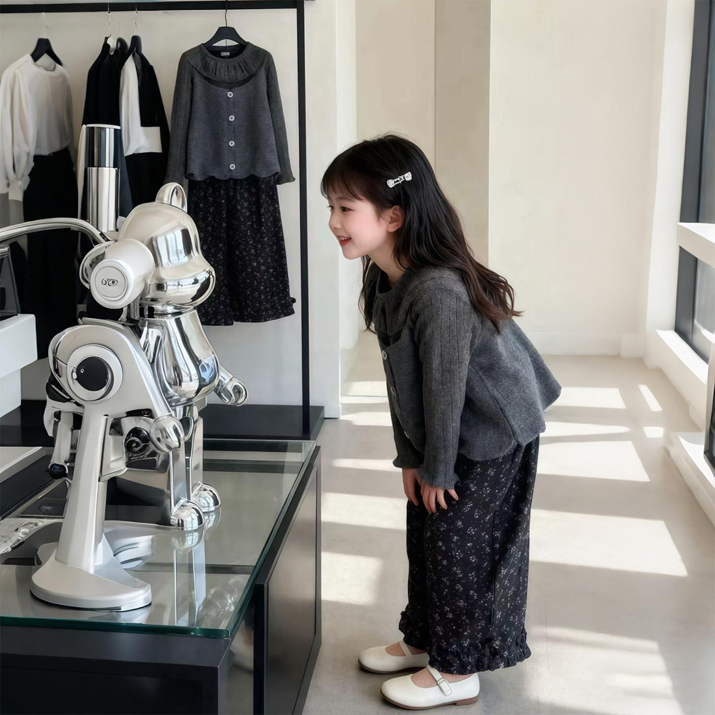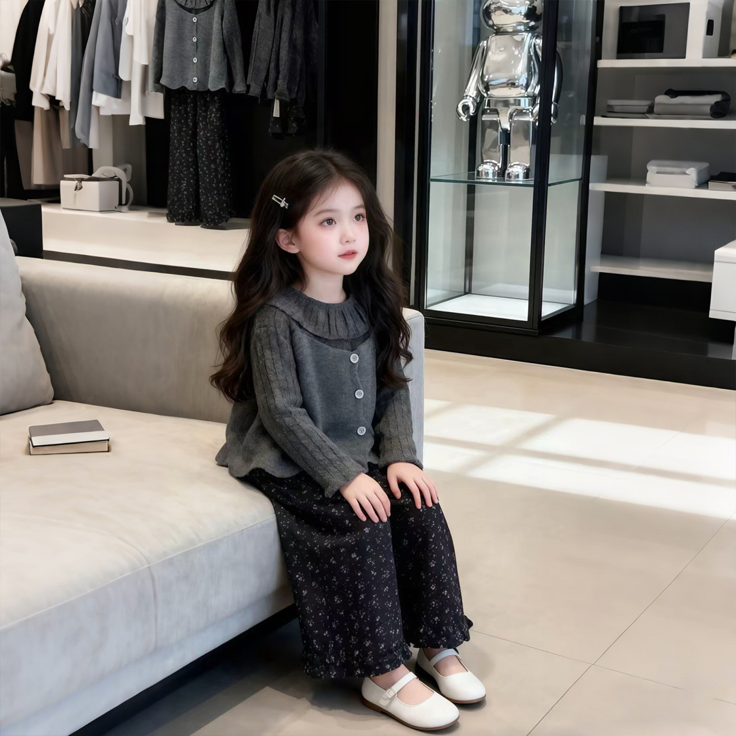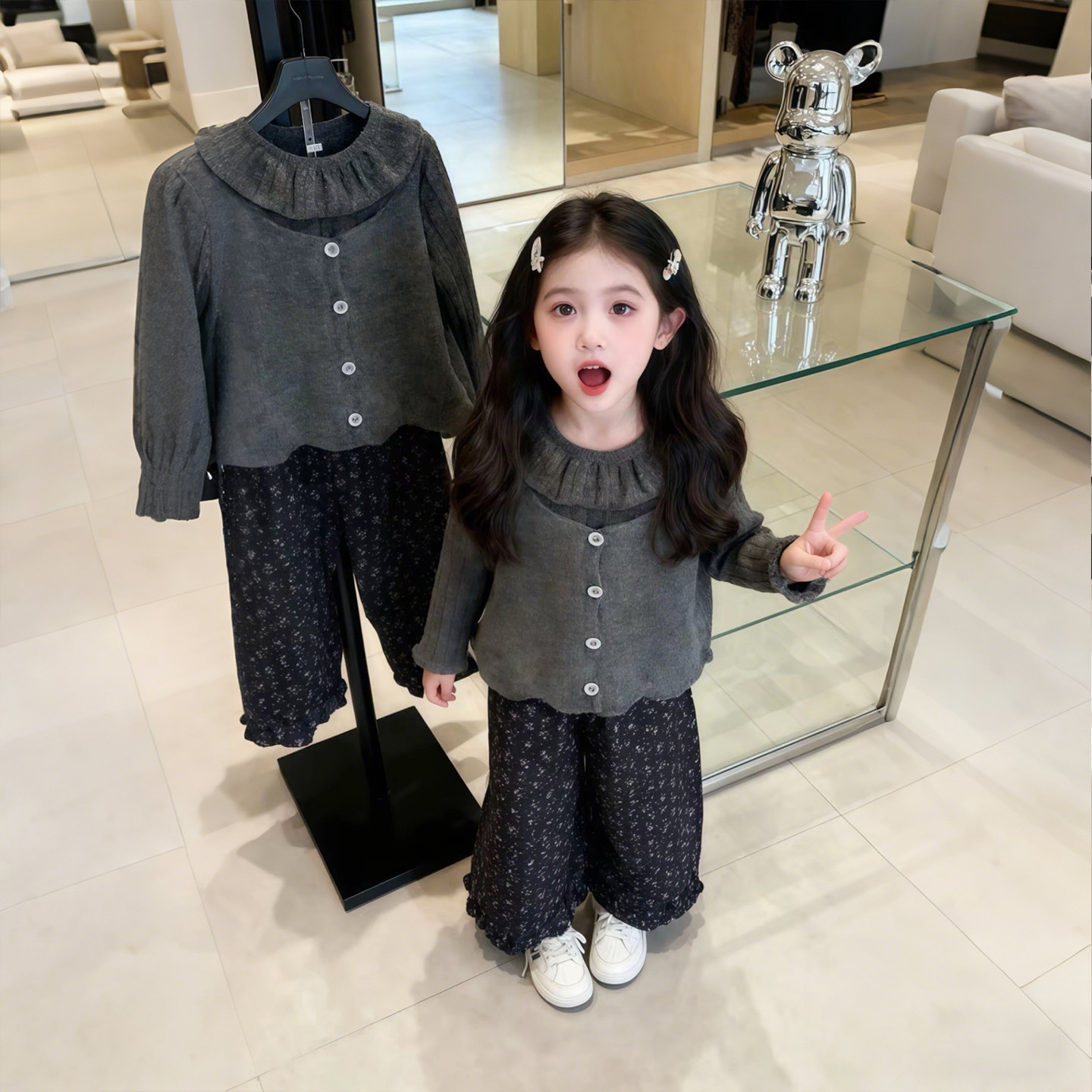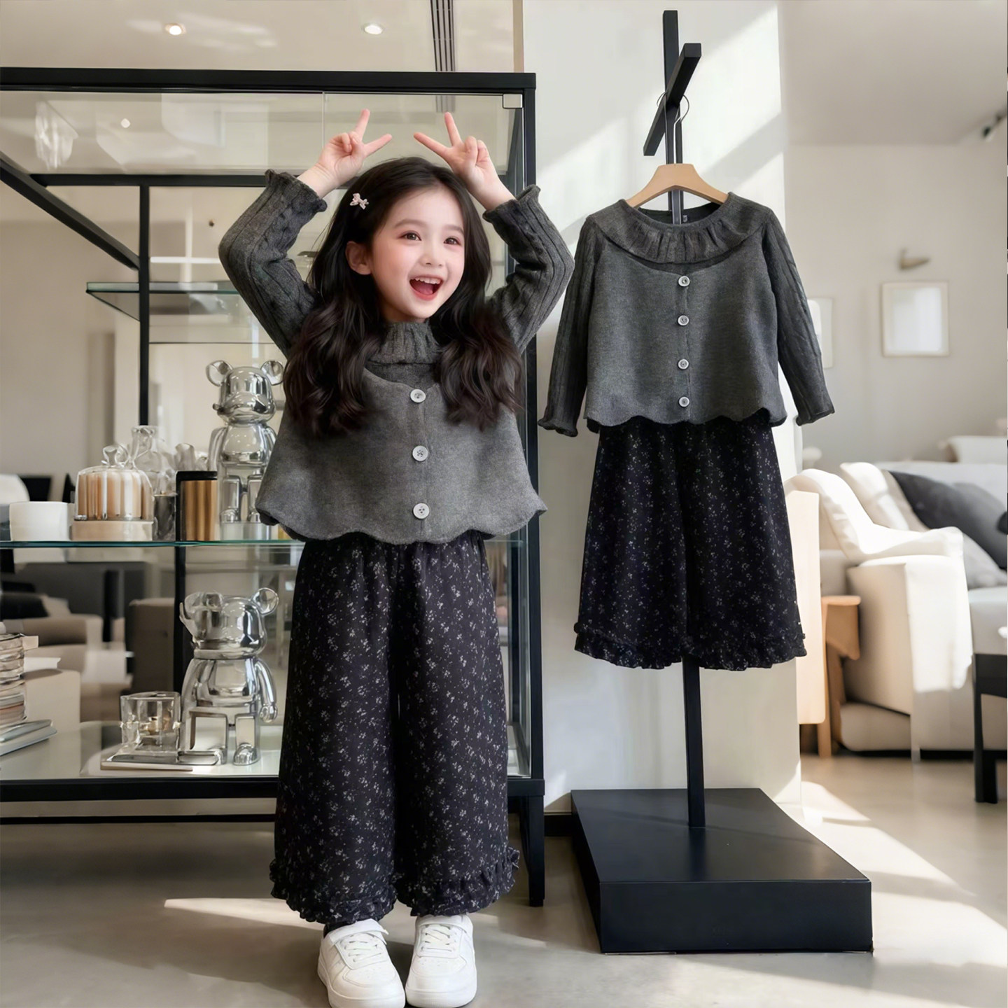 女童2026春秋新灰色荷叶领毛衣马甲三件套洋气女宝宝碎花裤子套装
