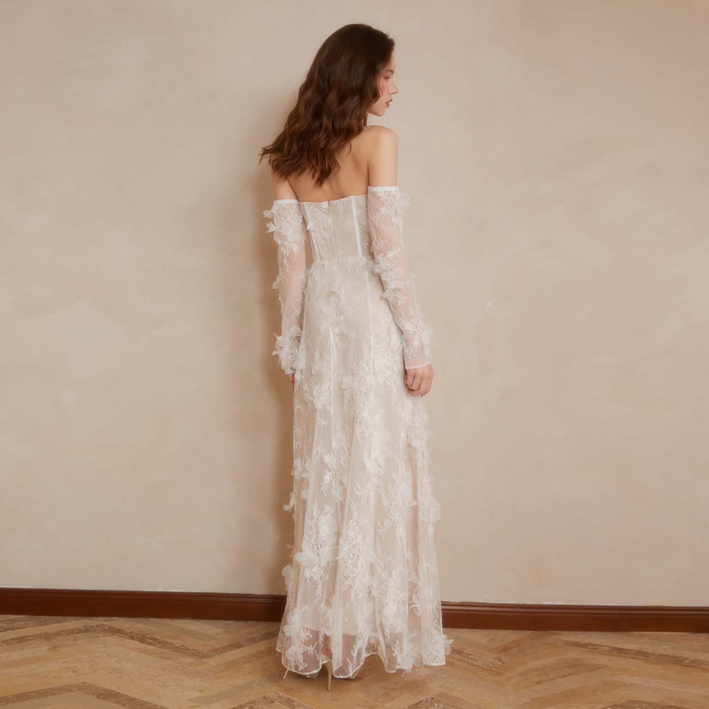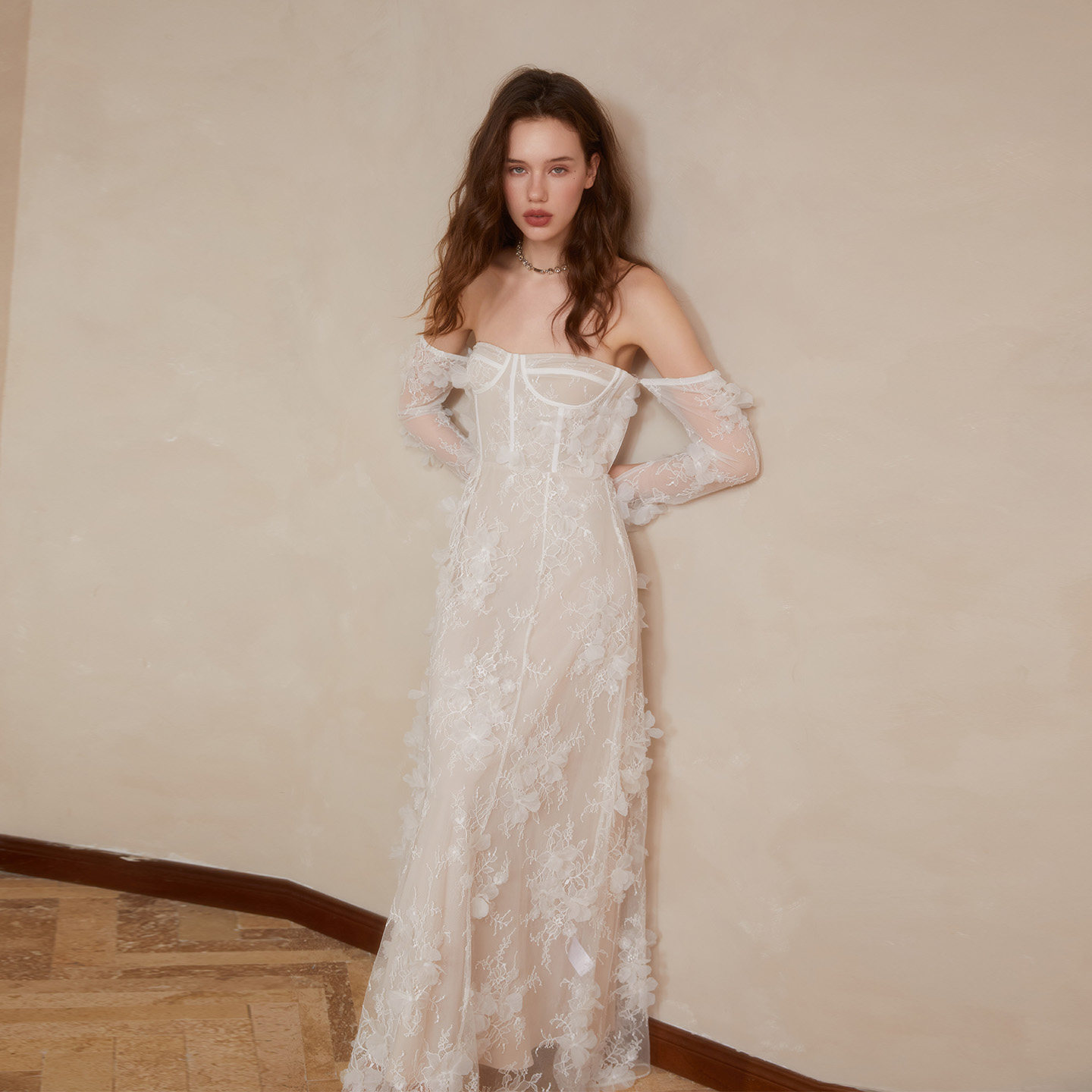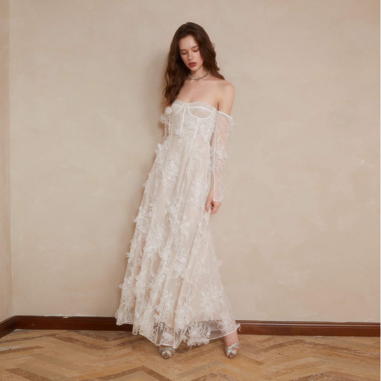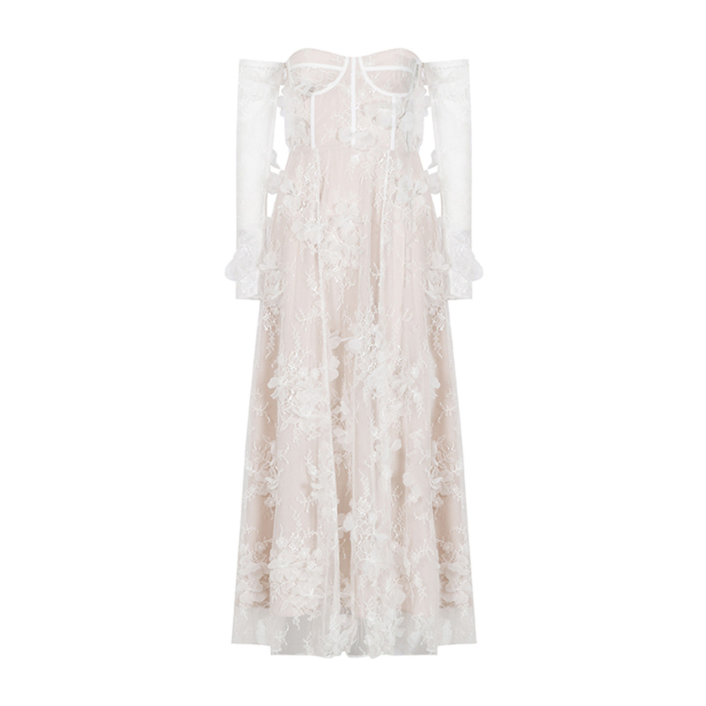 CEE CUBED白色蕾丝立体花朵长袖一字肩抹胸长裙连衣裙25早秋新款