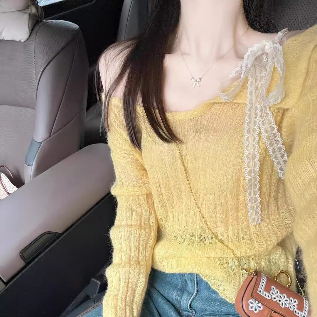 温柔马海毛蕾丝飘带针织衫上衣女春季薄款女款毛衣2025年夏季纯色