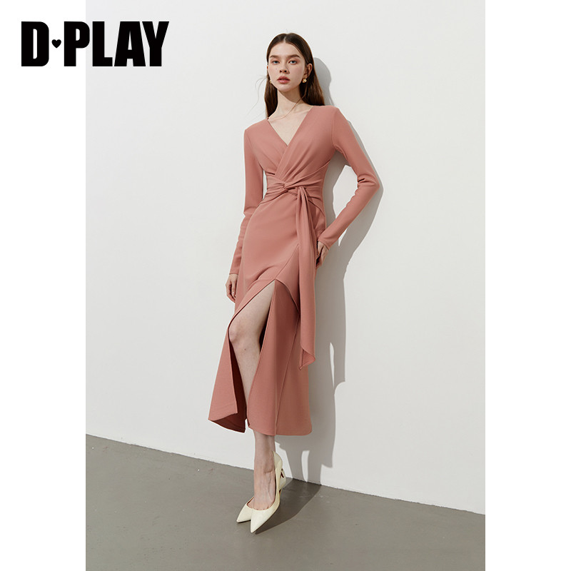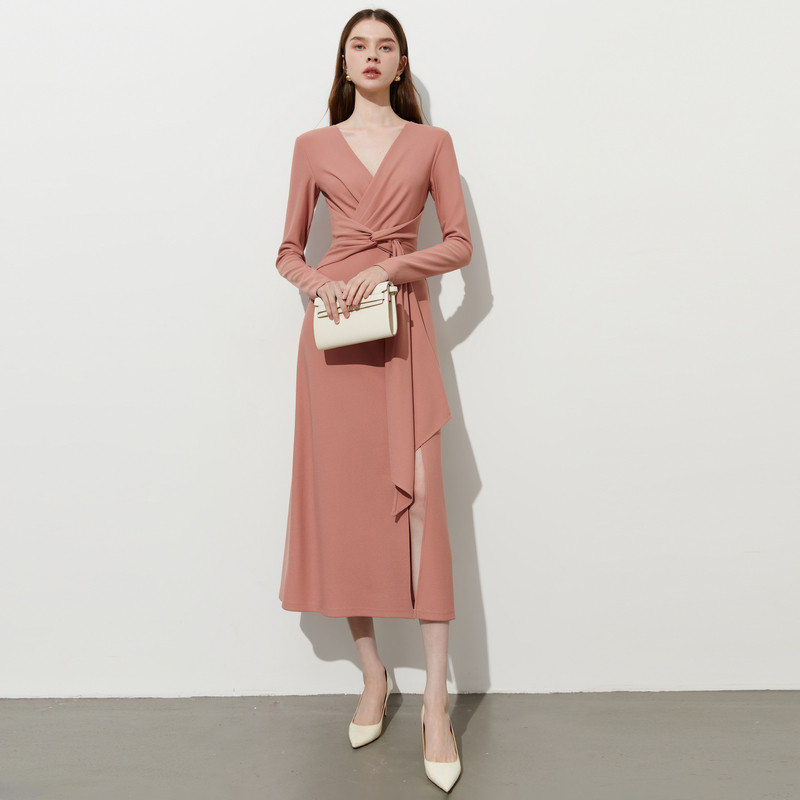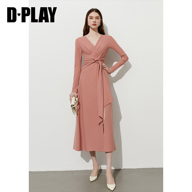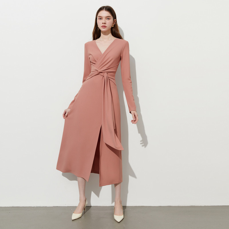 311线报网描述:V领领型,搭襟捏褶设计,腰部扭结设计