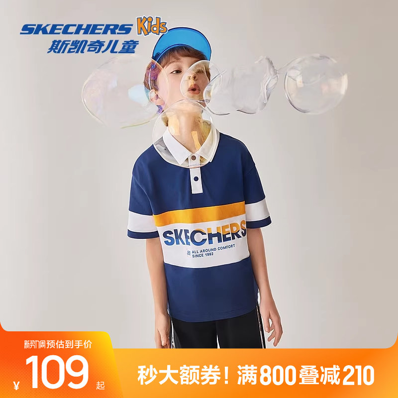 斯凯奇outlets童装男童梭织衬衫儿童T恤休闲蓝色透气翻领短袖衫