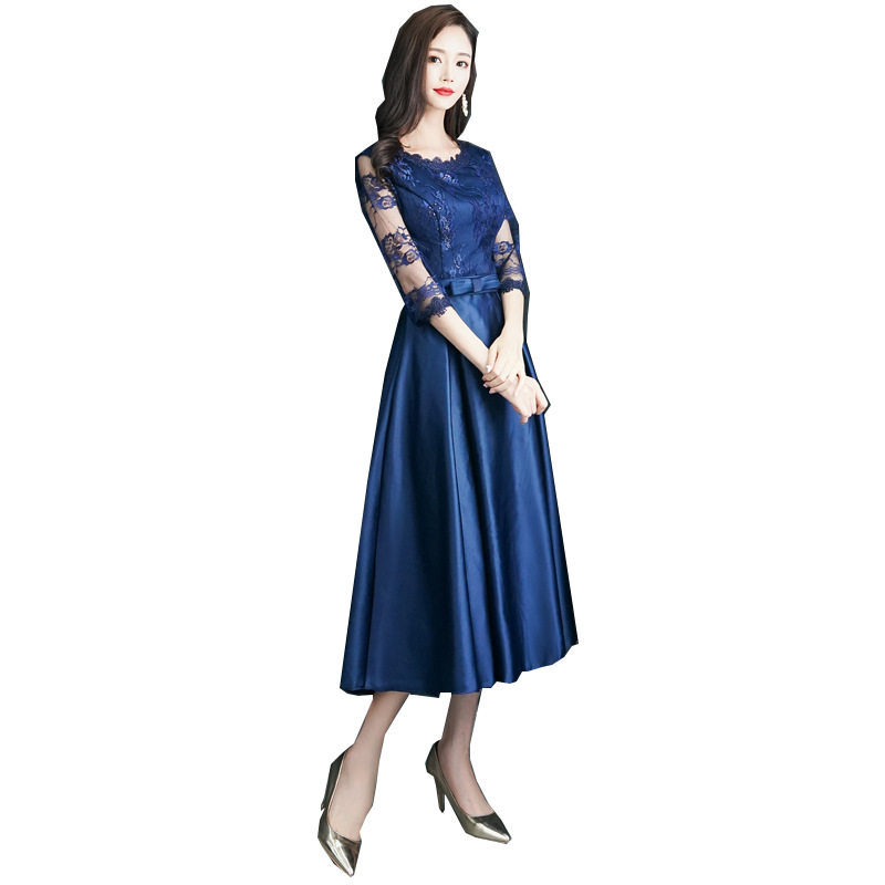 藏青色晚礼服女2026夏季新款中长款宴会连衣裙显瘦蕾丝长袖礼服