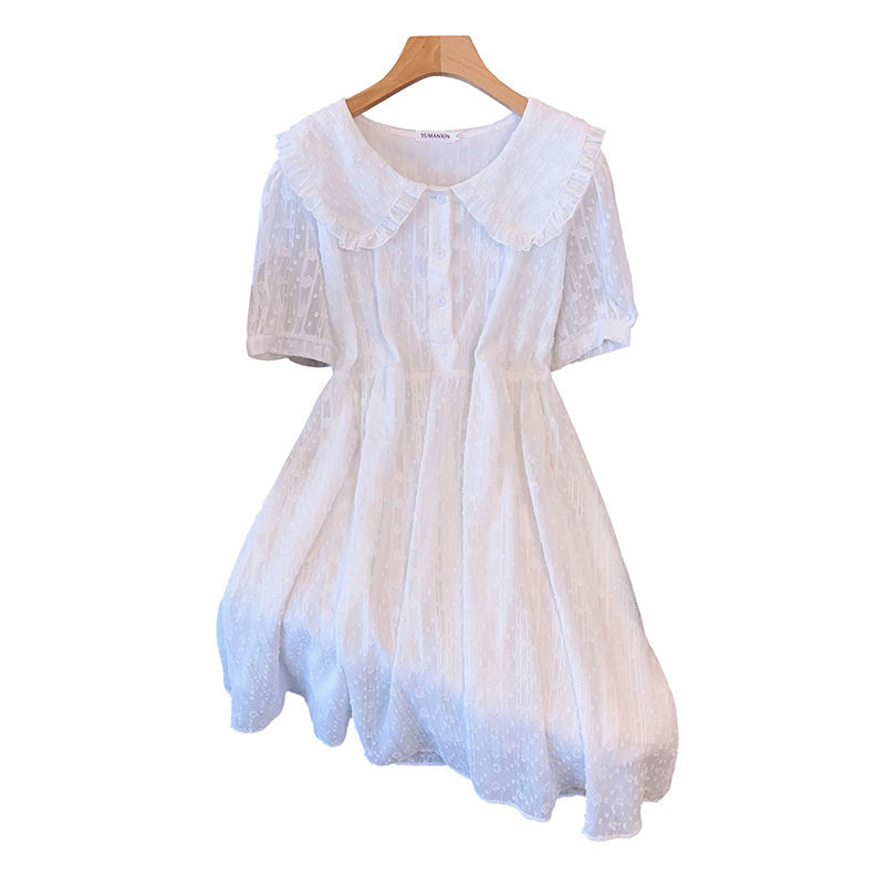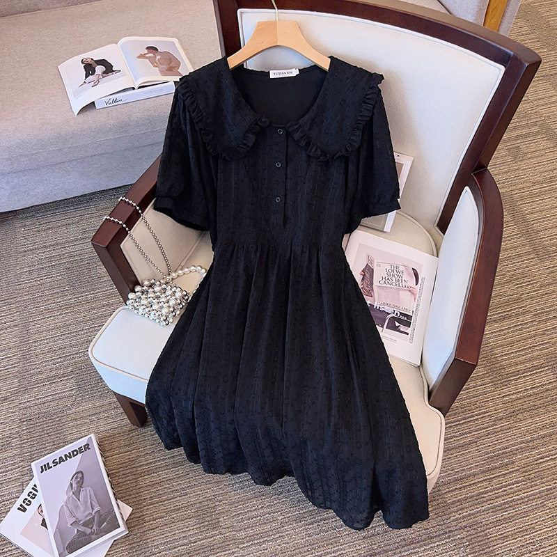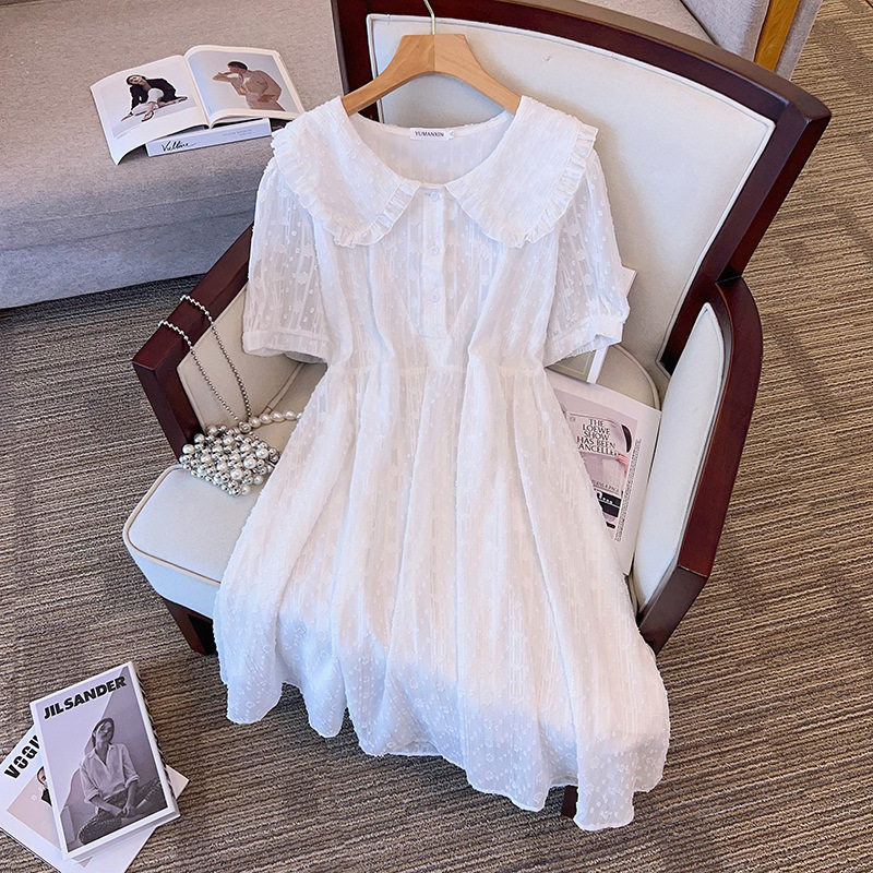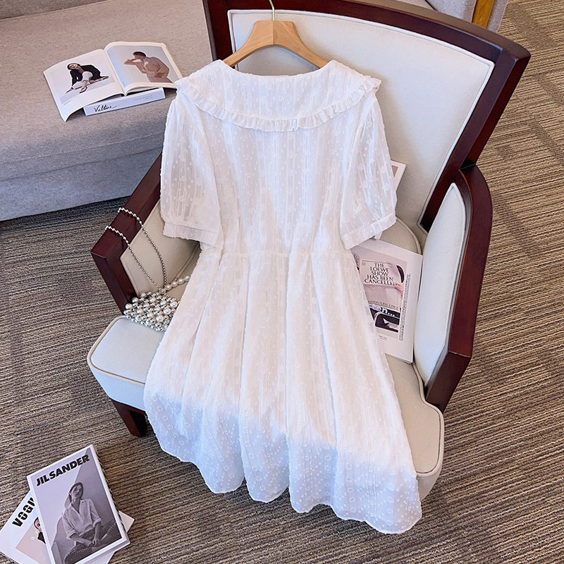 300斤特大码女装夏200胖mm甜美花边娃娃领收腰显瘦中长雪纺连衣裙