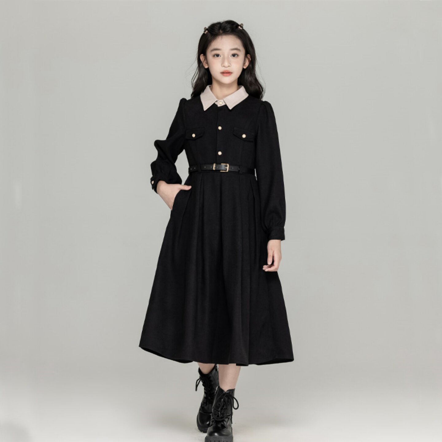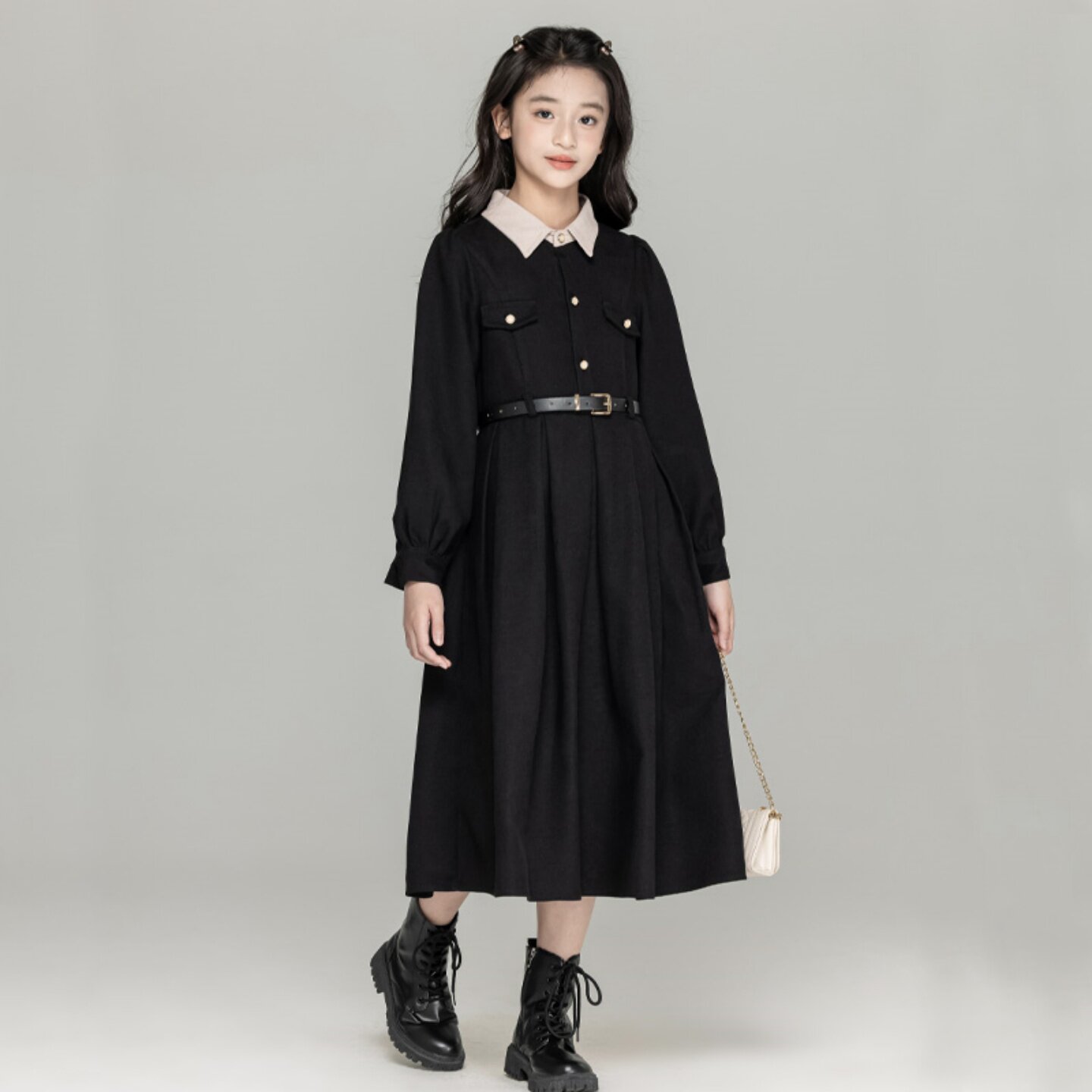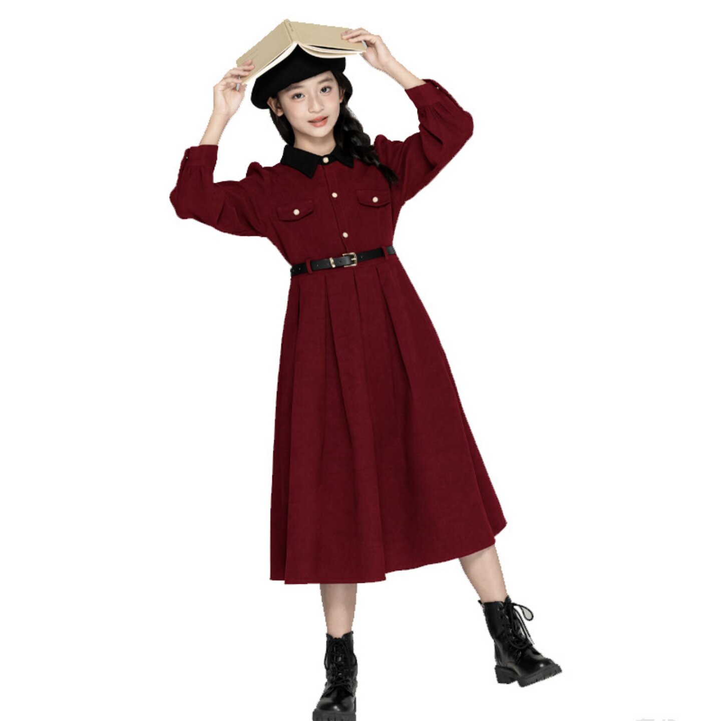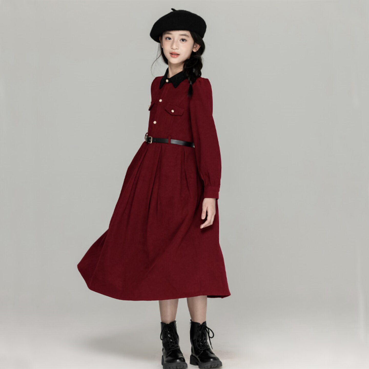 女童小香风连衣裙秋冬款学院衬衫裙气质显瘦亲子装中大童红色裙子