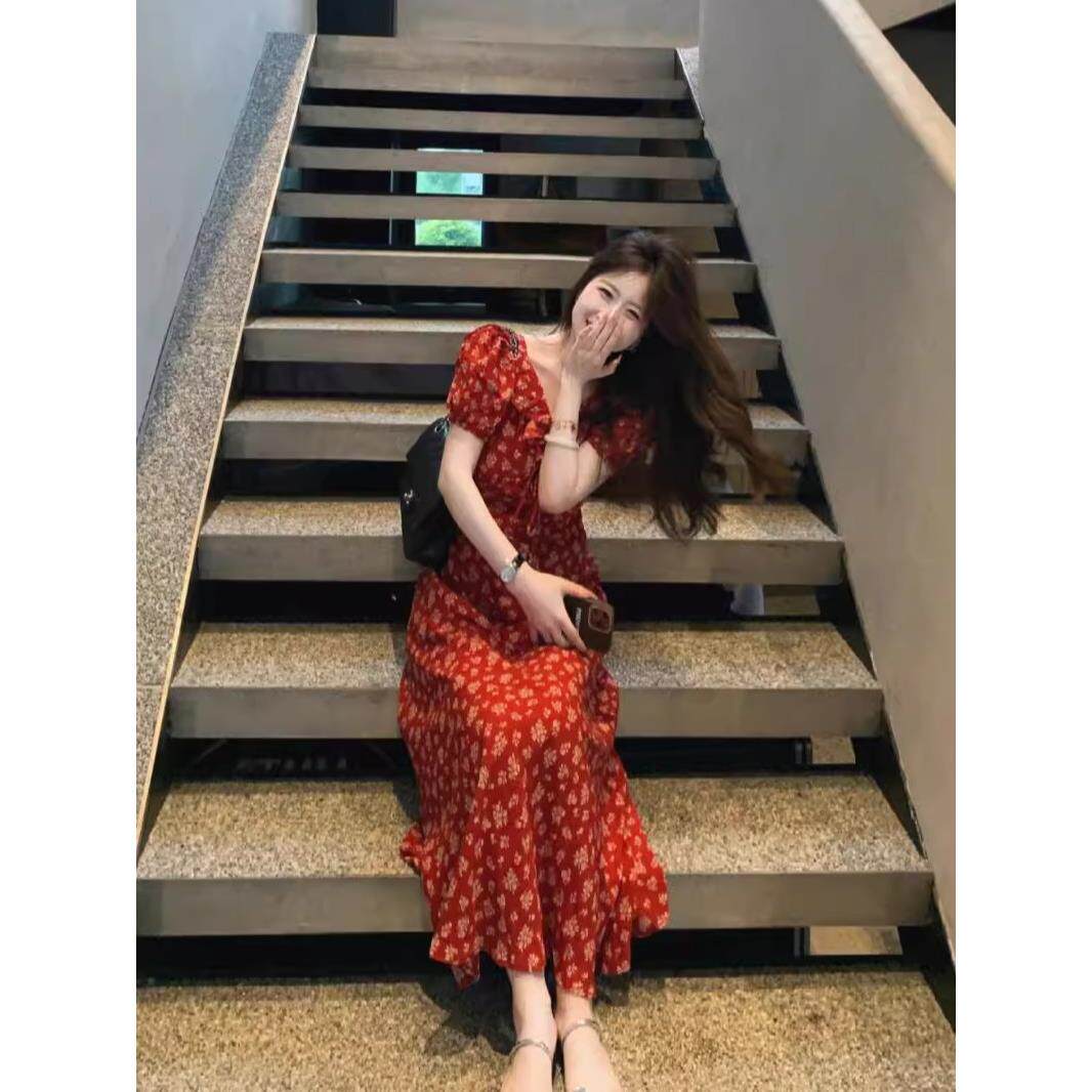 V领红色碎花连衣裙女装夏季大码胖mm收腰法式漂亮绝美雪纺长裙子