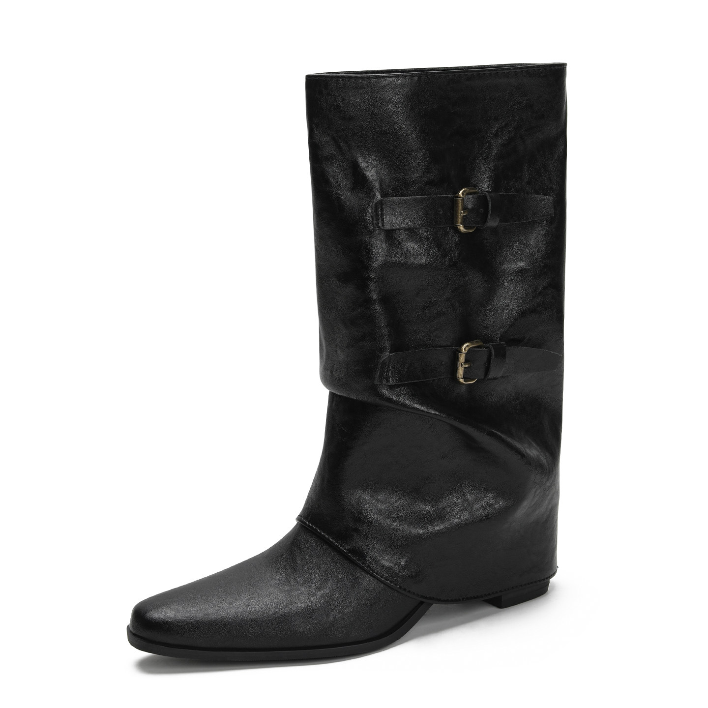 真皮~尖头西部牛仔靴女2025秋冬新款褶皱堆堆裤管靴高跟中筒短靴