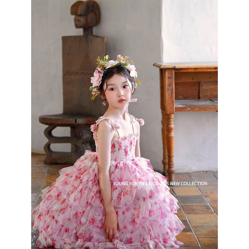 YFY花仙子女童碎花连衣裙春夏公主裙蓬蓬裙桃粉吊带裙度假风