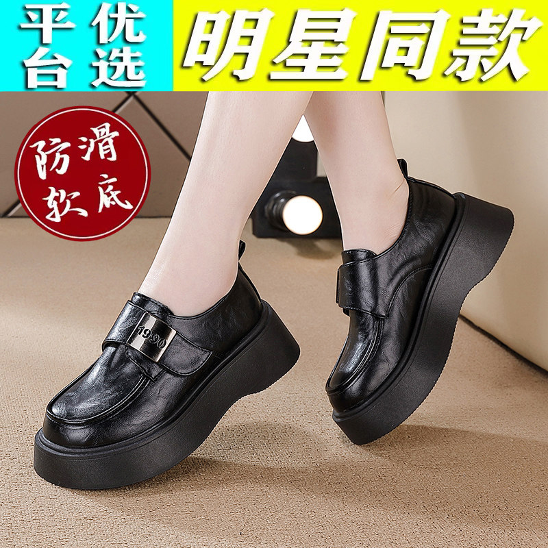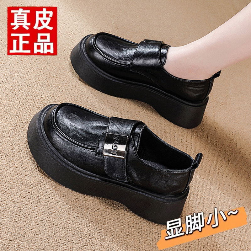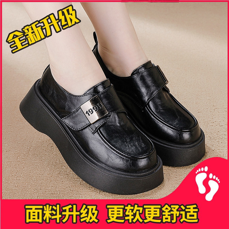 品牌2026春季新款厚底魔术贴休闲乐福鞋女黑色英伦风增高小皮鞋子