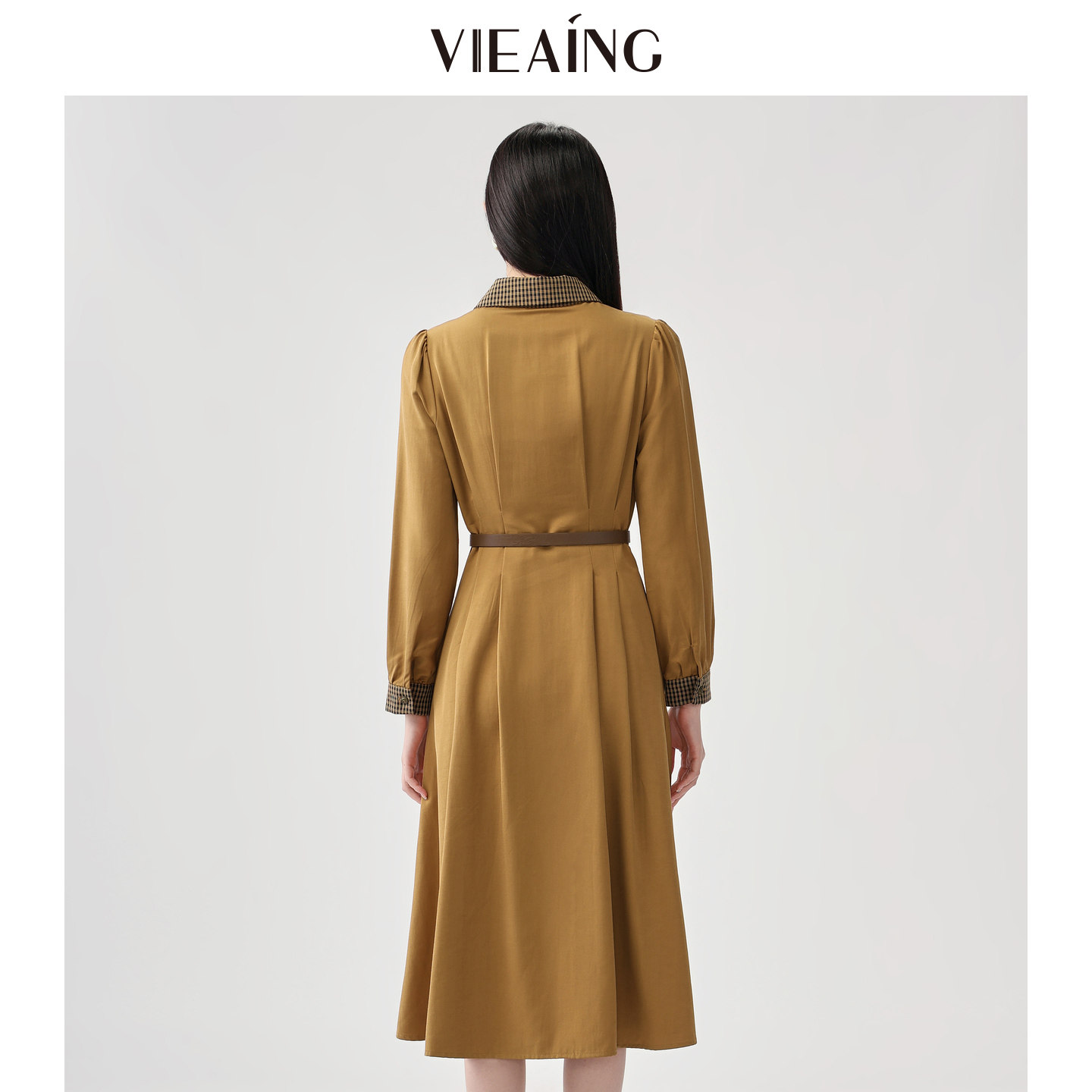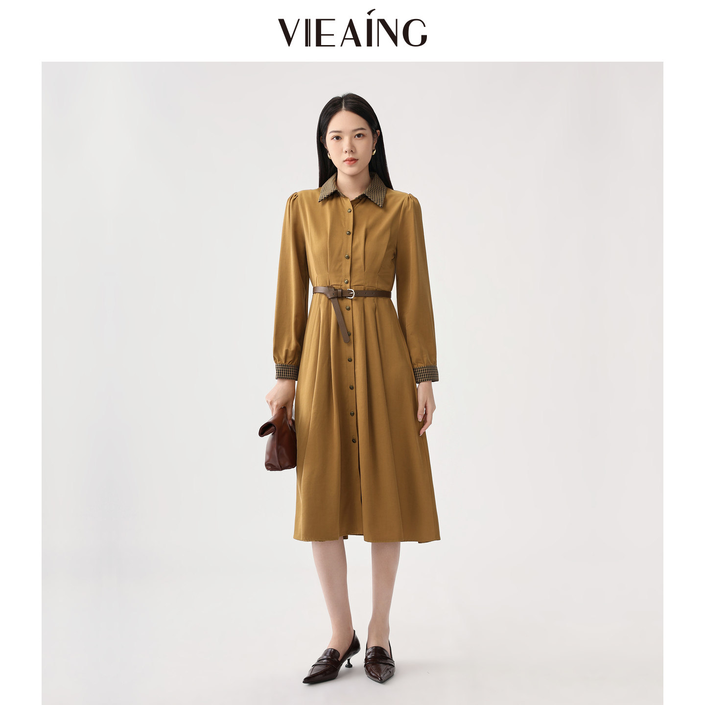 VIEA.ING薇迎长袖连衣裙女2026春季穿搭新款配腰带复古小个子裙子