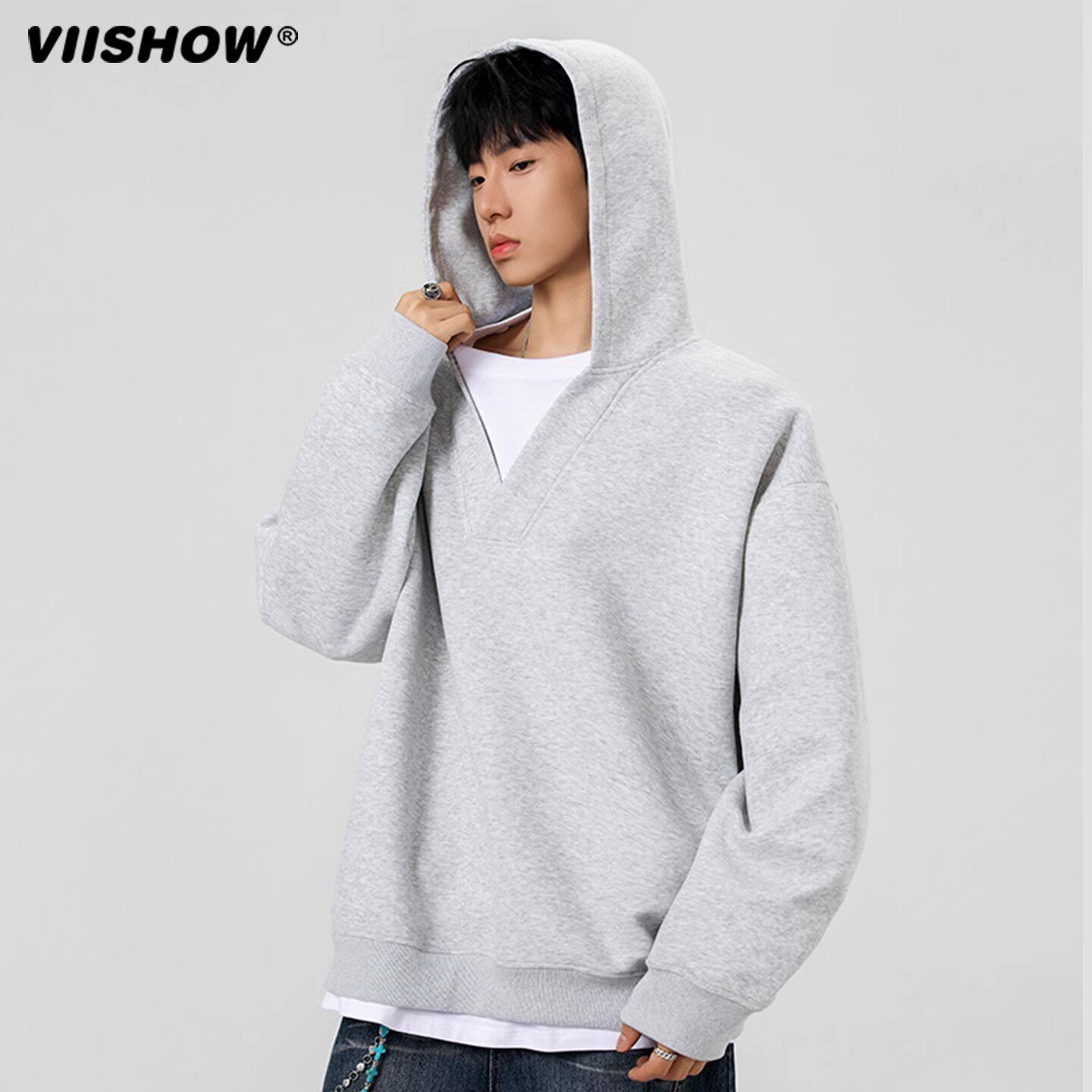 VIISHOW秋季简约撞色V领假两件连帽卫衣男潮牌宽松情侣高级感帽衫
