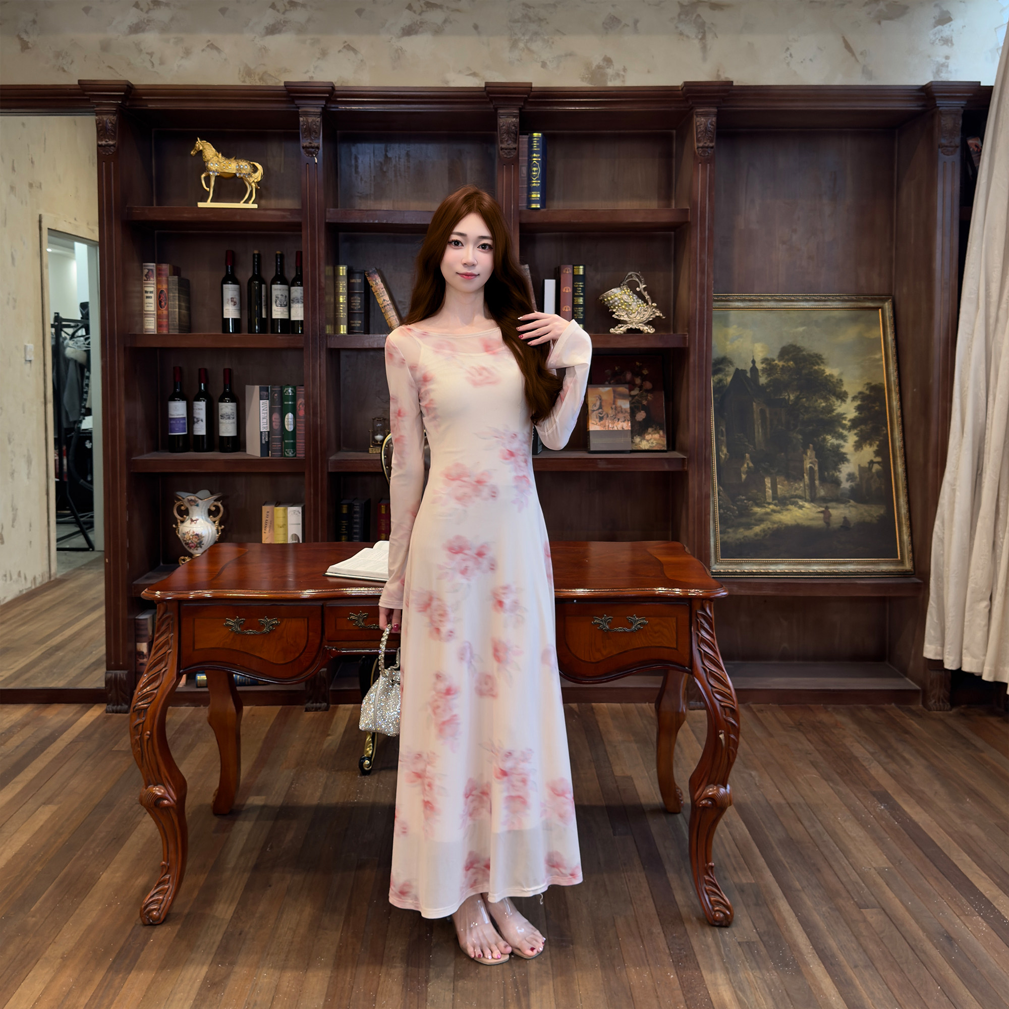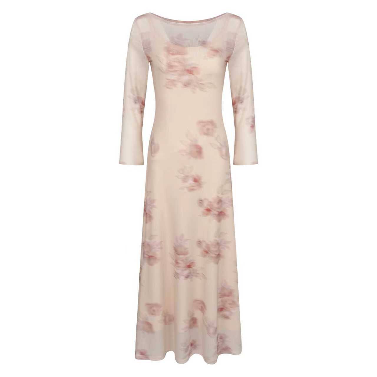 286法式碎花网纱长袖连衣裙女装2026春季小众新款收腰显瘦长裙