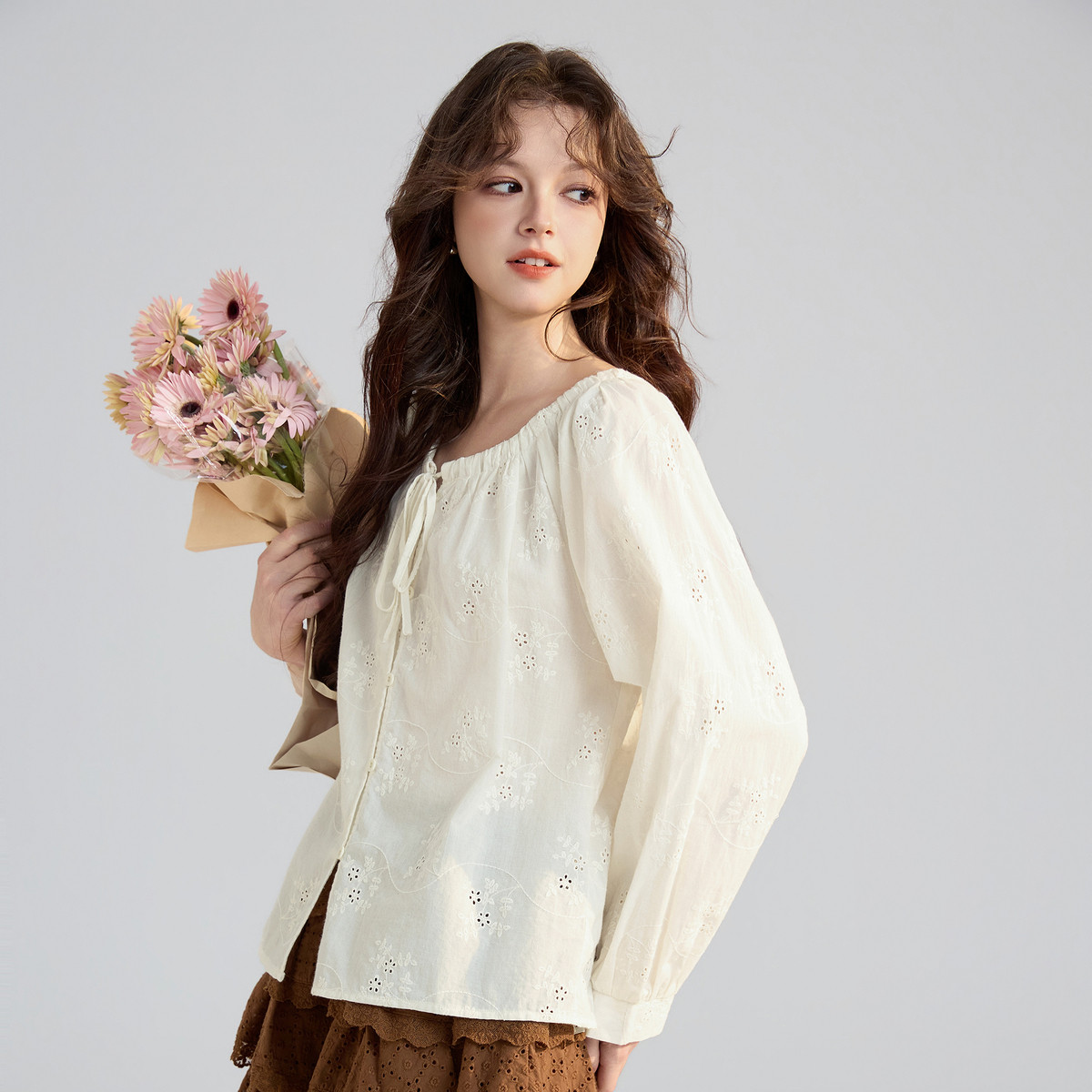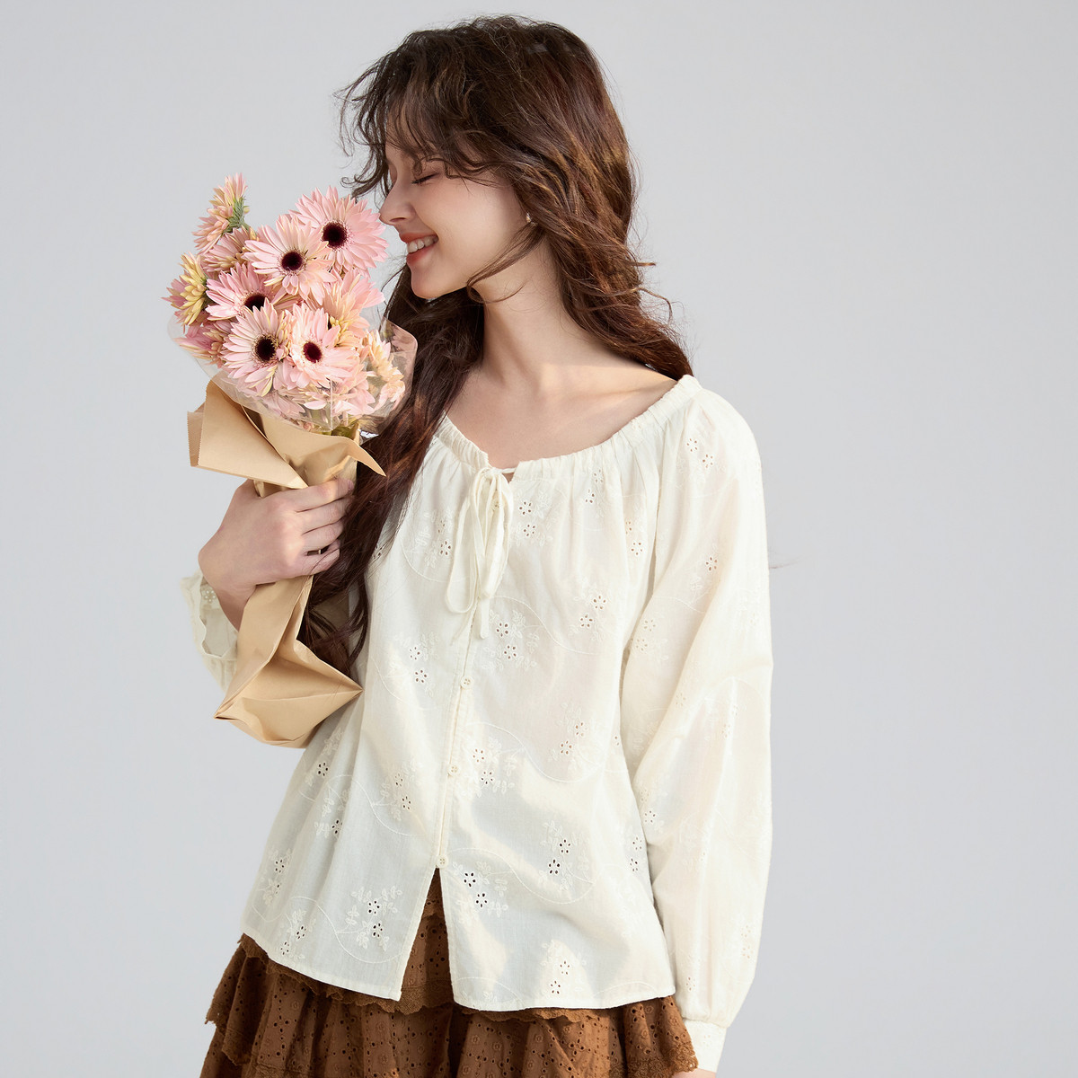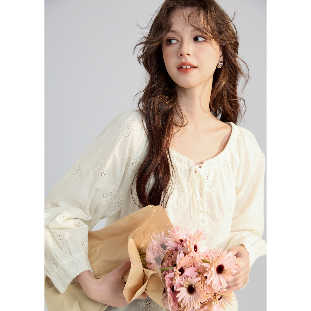 唐狮春季长袖衬衫女款2026蕾丝甜美泡泡袖休闲上衣镂空小众设计感