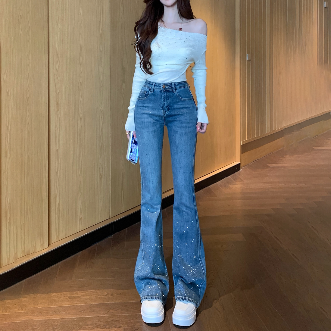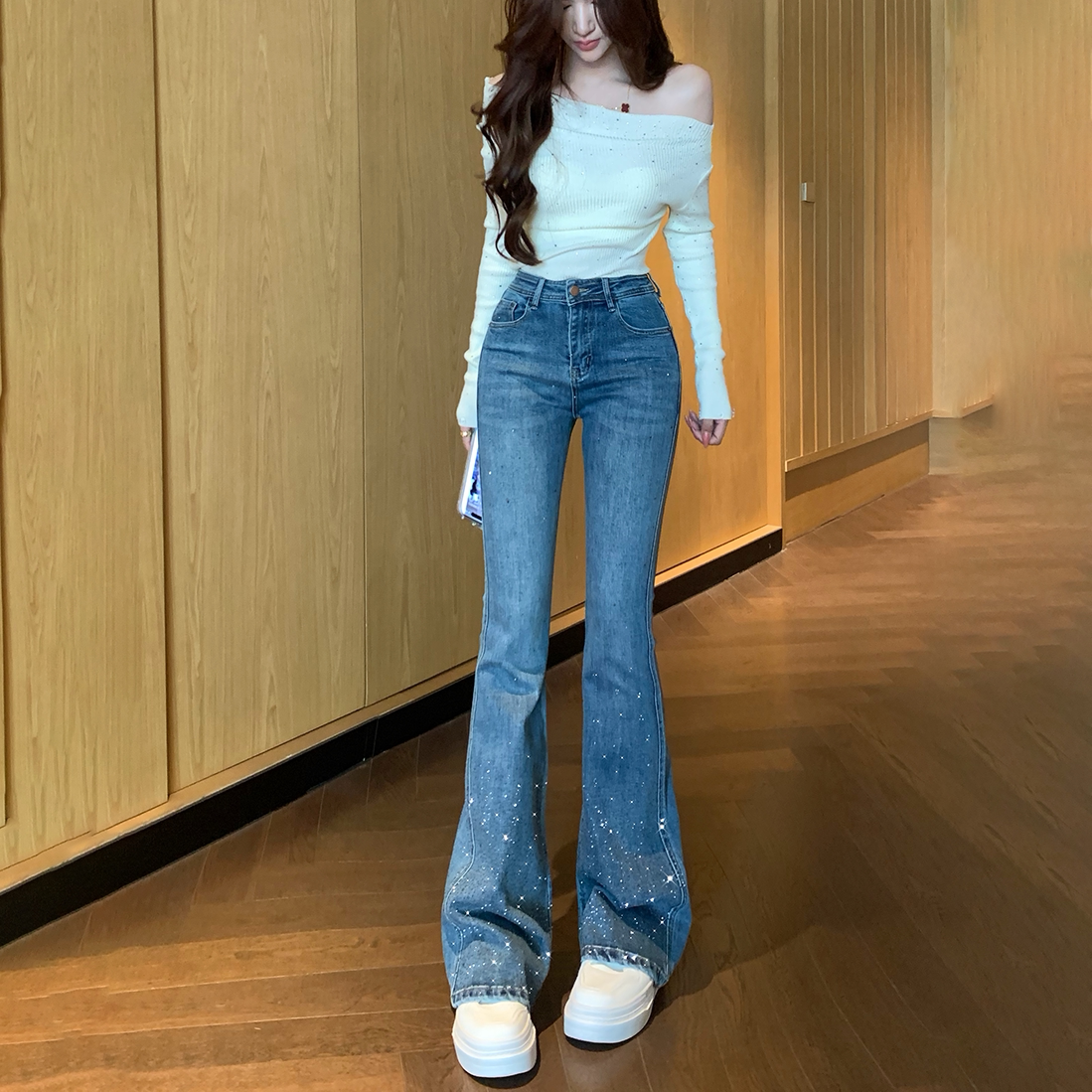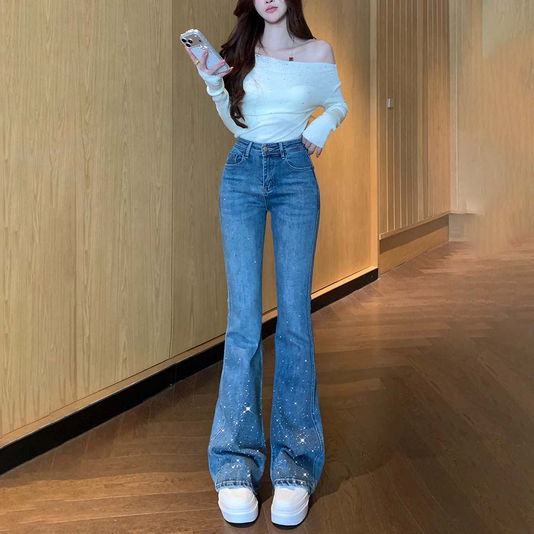 李李服饰密闪烫钻重工高腰微喇牛仔裤女2026年夏季新款弹力喇叭裤