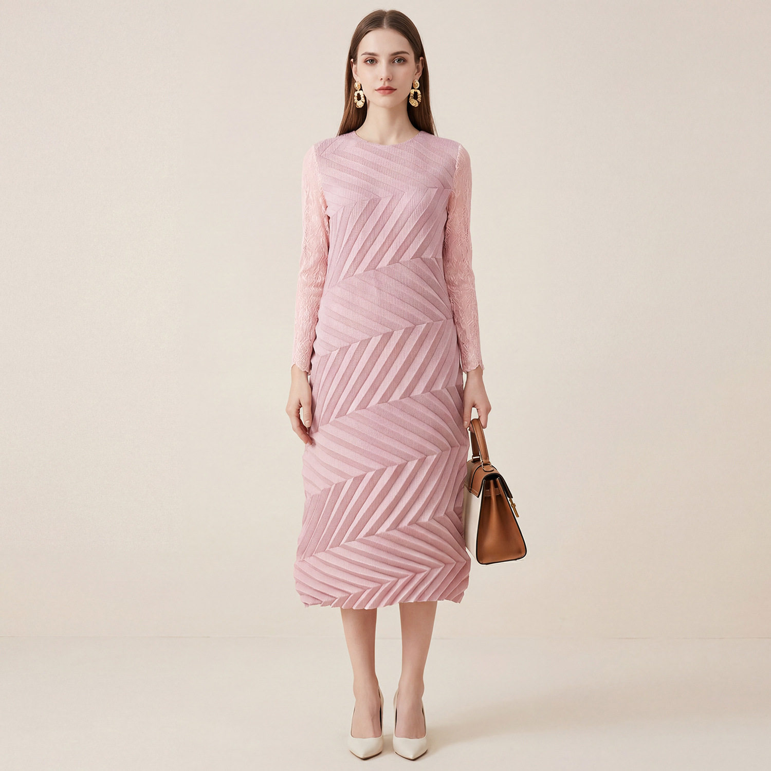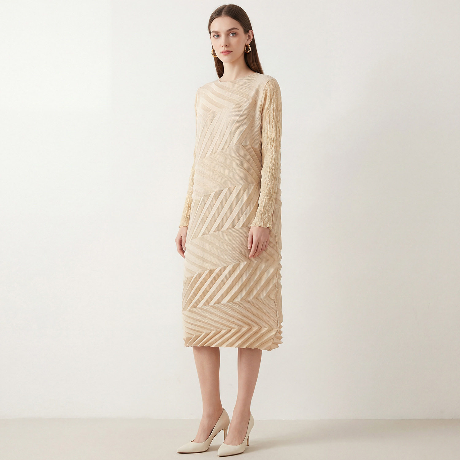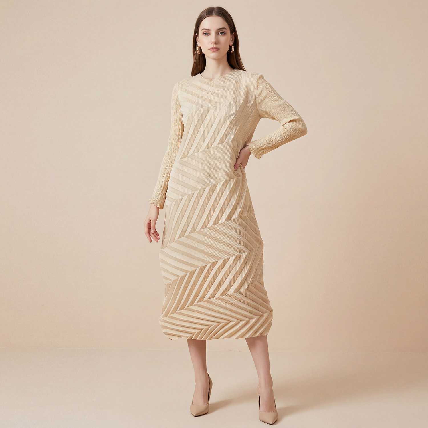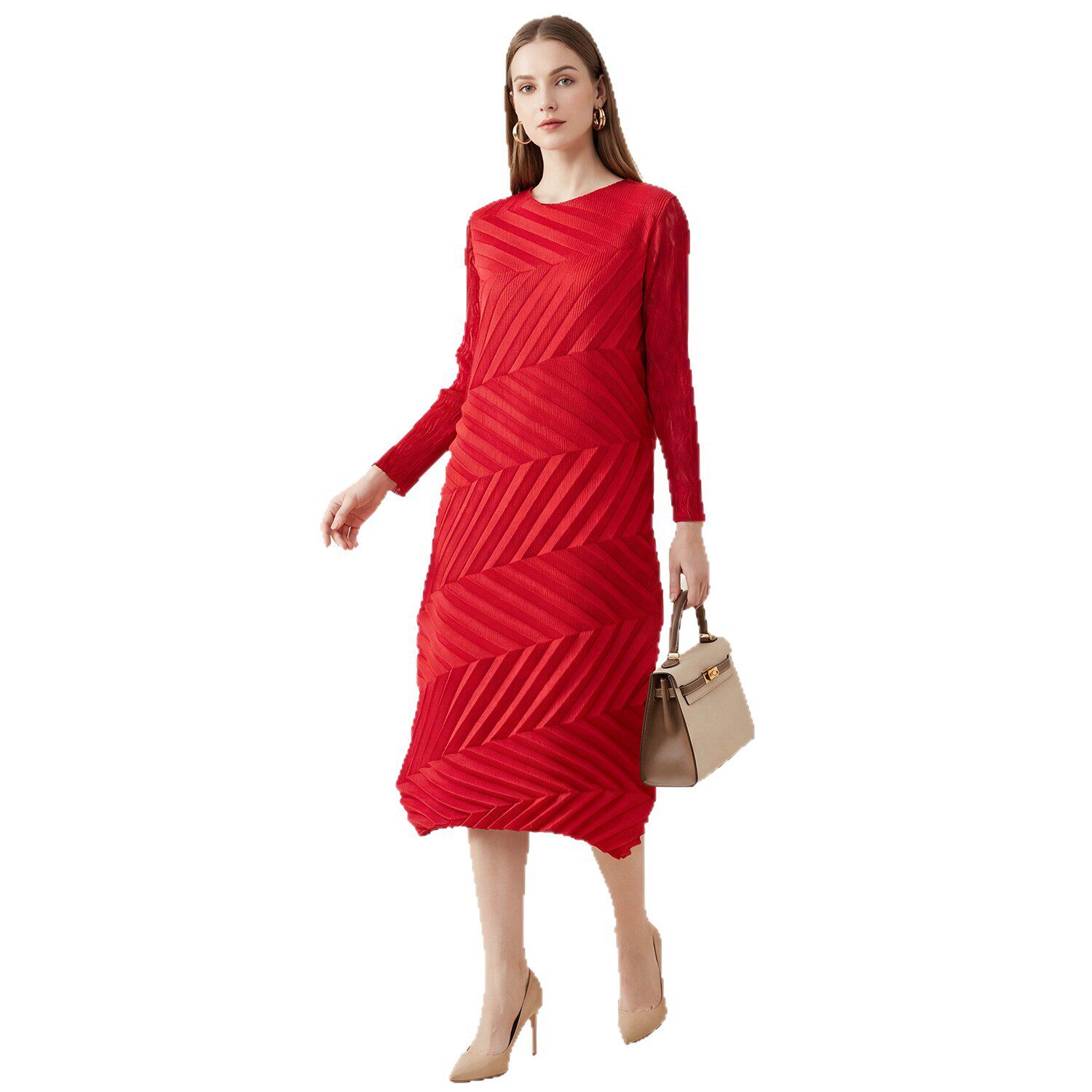 三宅春季褶皱红色长袖连衣裙显瘦大码独特漂亮气质不规则圆领长裙
