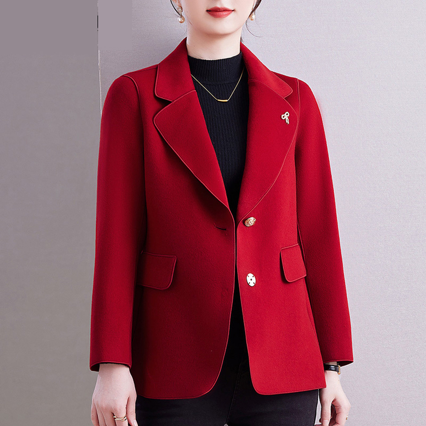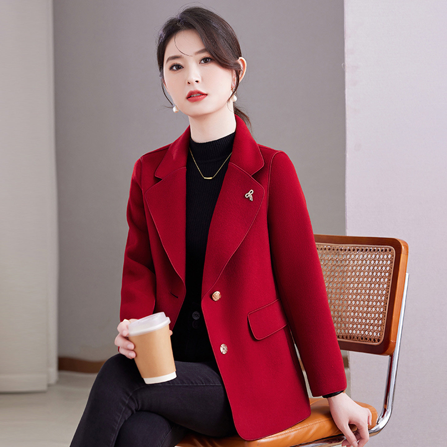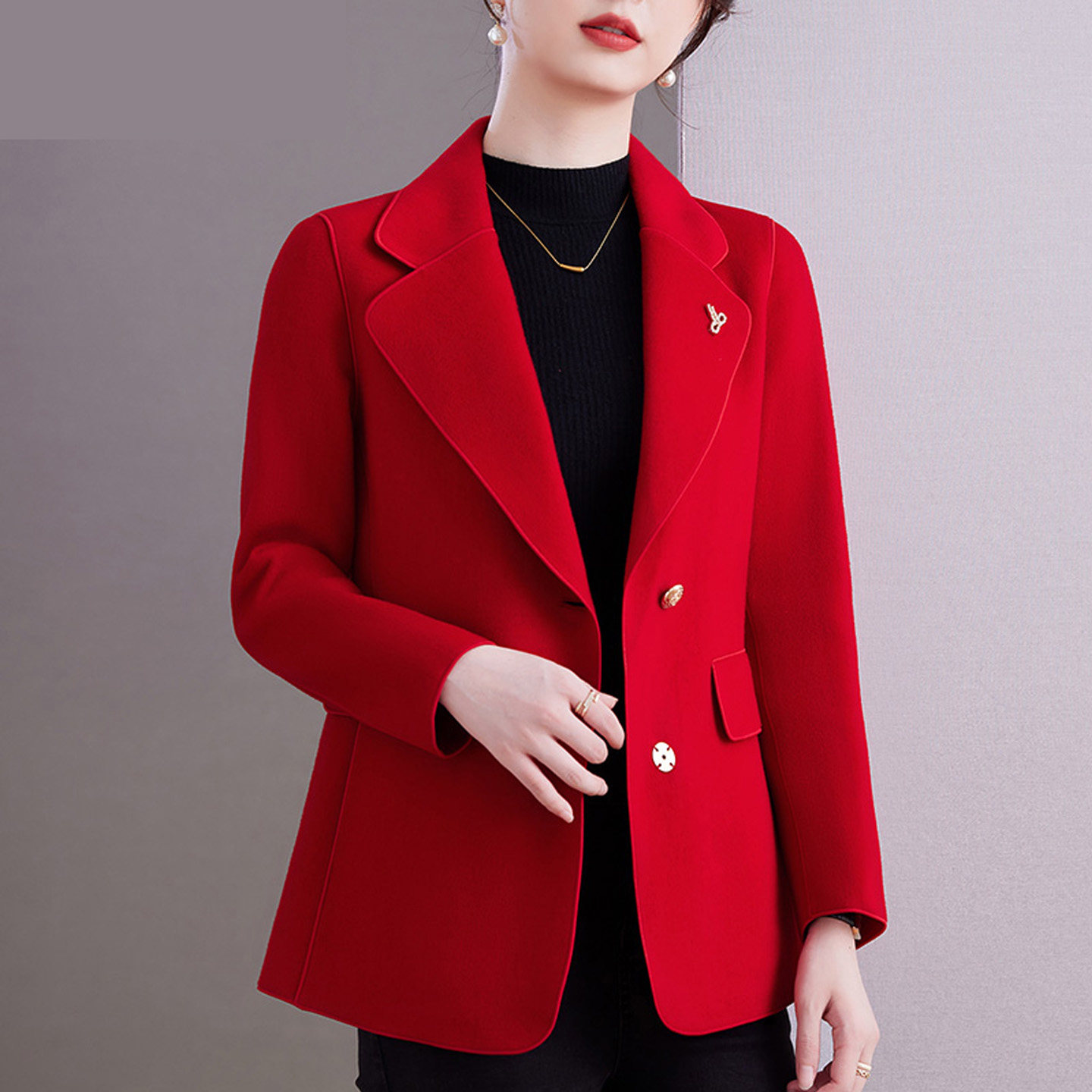 双面呢大衣新中式羊毛立领短款大衣女盘扣红色高级感气质毛呢外套