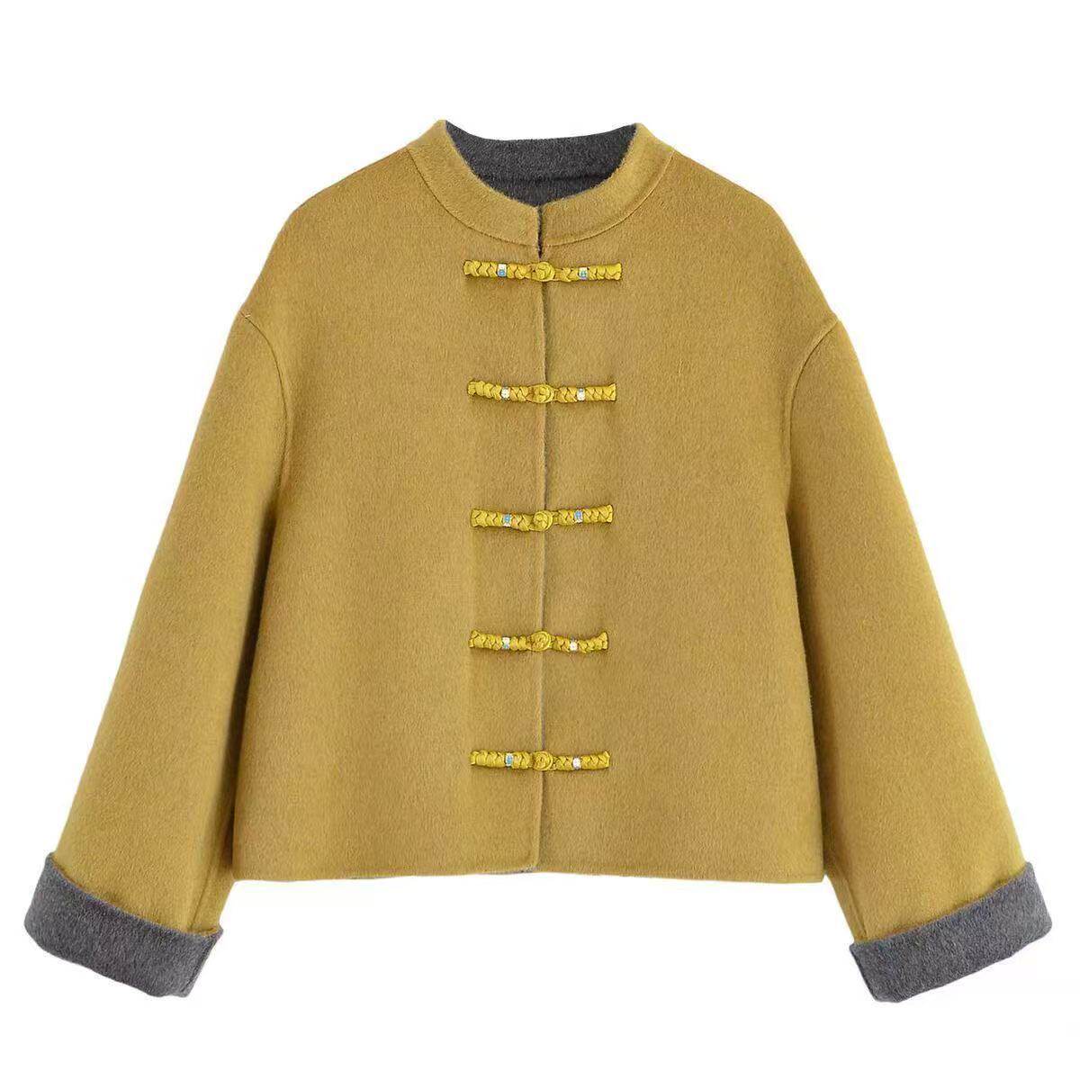新中式红色双面羊毛大衣女短款立领盘扣高级感撞色国风羊毛呢外套