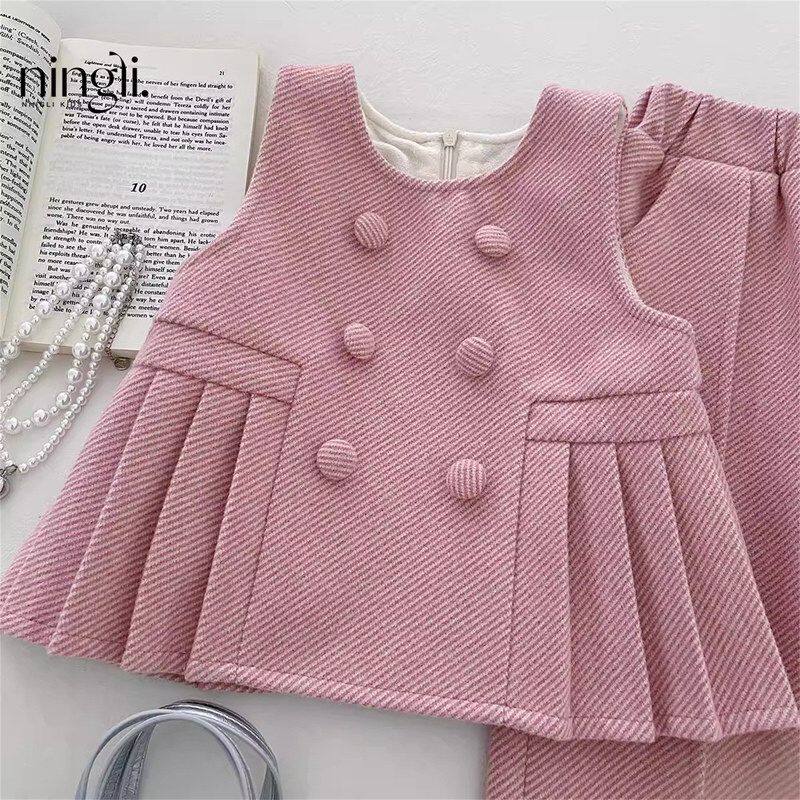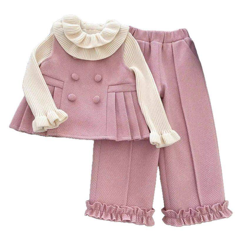 柠里女童小香风套装秋冬新款洋气百褶花边加绒加厚上衣裤子两件套