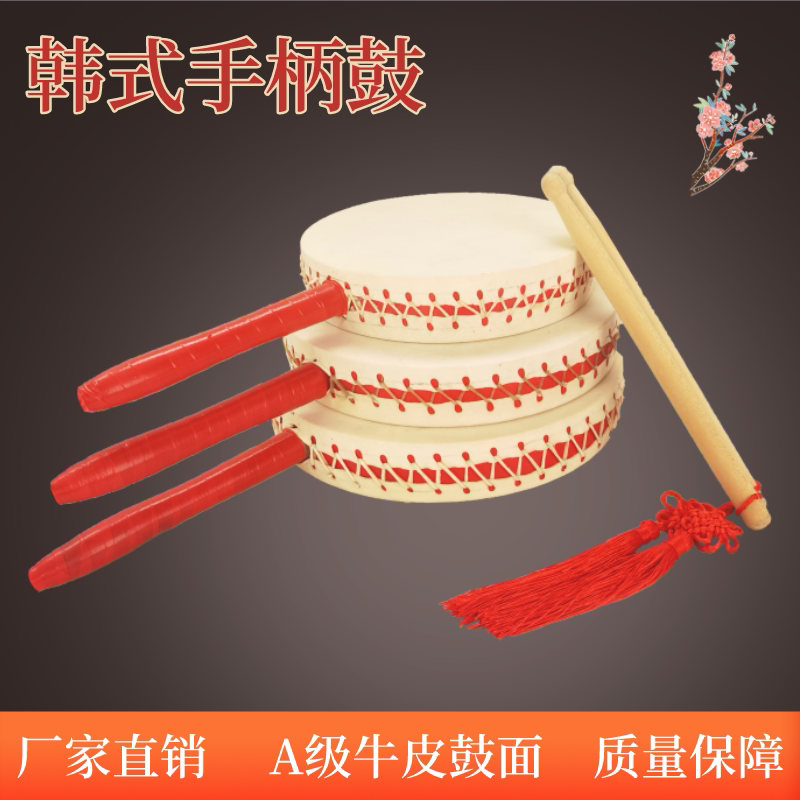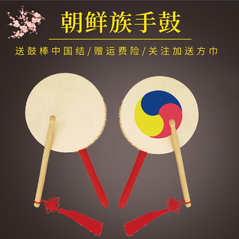 包邮牛皮舞蹈演出潘绳彩绘朝鲜族手鼓 韩式手柄鼓 装饰道具送鼓棒