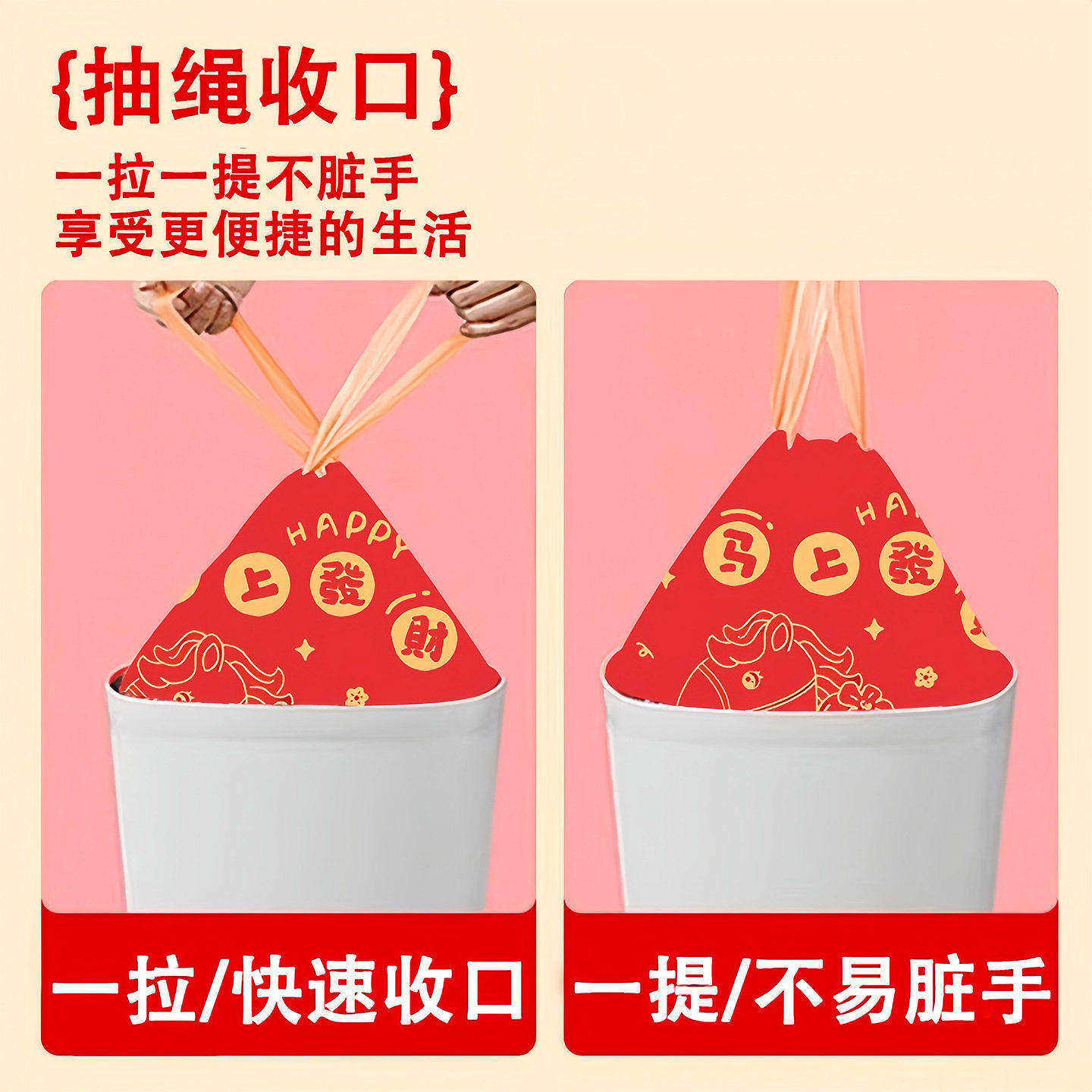 新年垃圾袋家用加厚手提式免撕大号抽绳超厚厨房用马年红色清洁袋