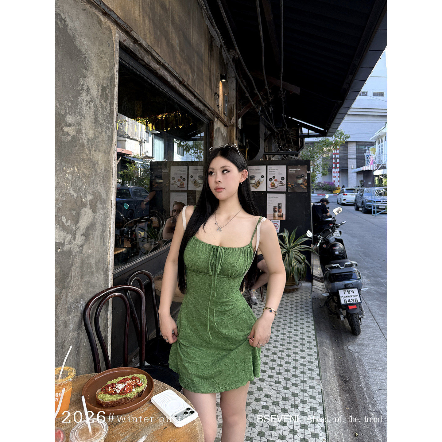 黑泽玄七2026春夏微胖方领绑带吊带裙肌理提花收腰a字短款连衣裙