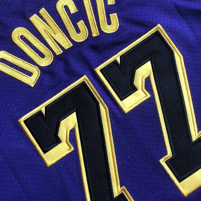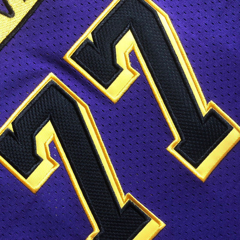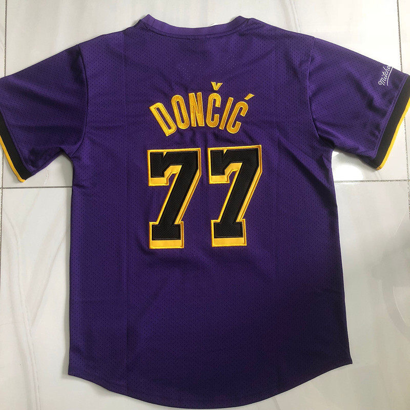 全刺绣美版湖人队77号东契奇球衣宣告紫色短袖网眼男女休闲篮球服