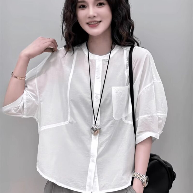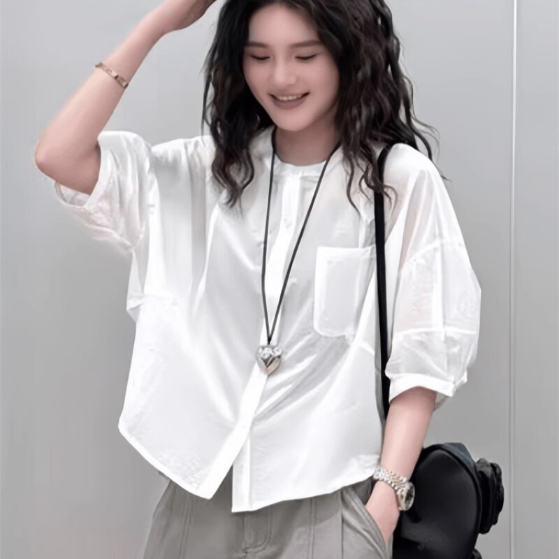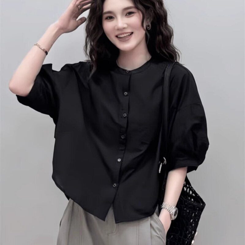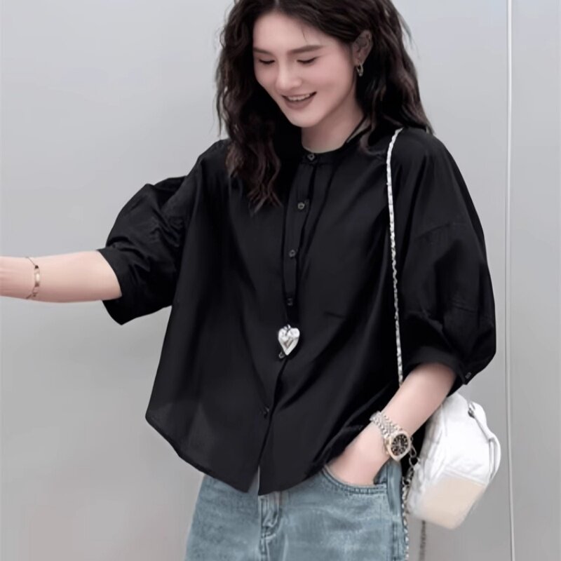 法式黑色短袖衬衫女夏季2026新款爆款泡泡袖宽松显瘦上衣衬衣女款
