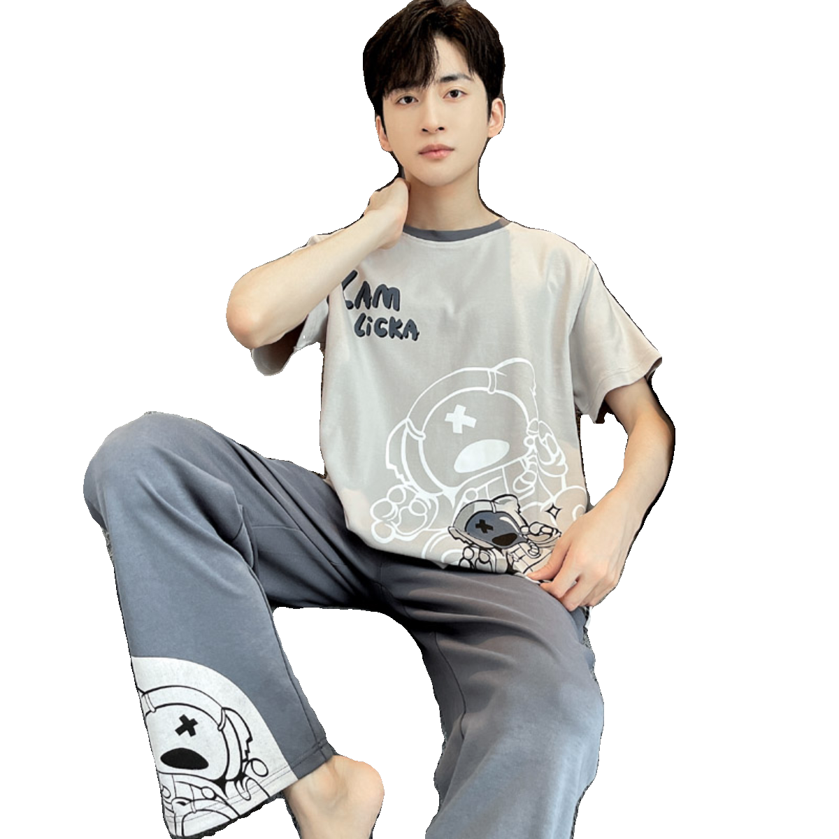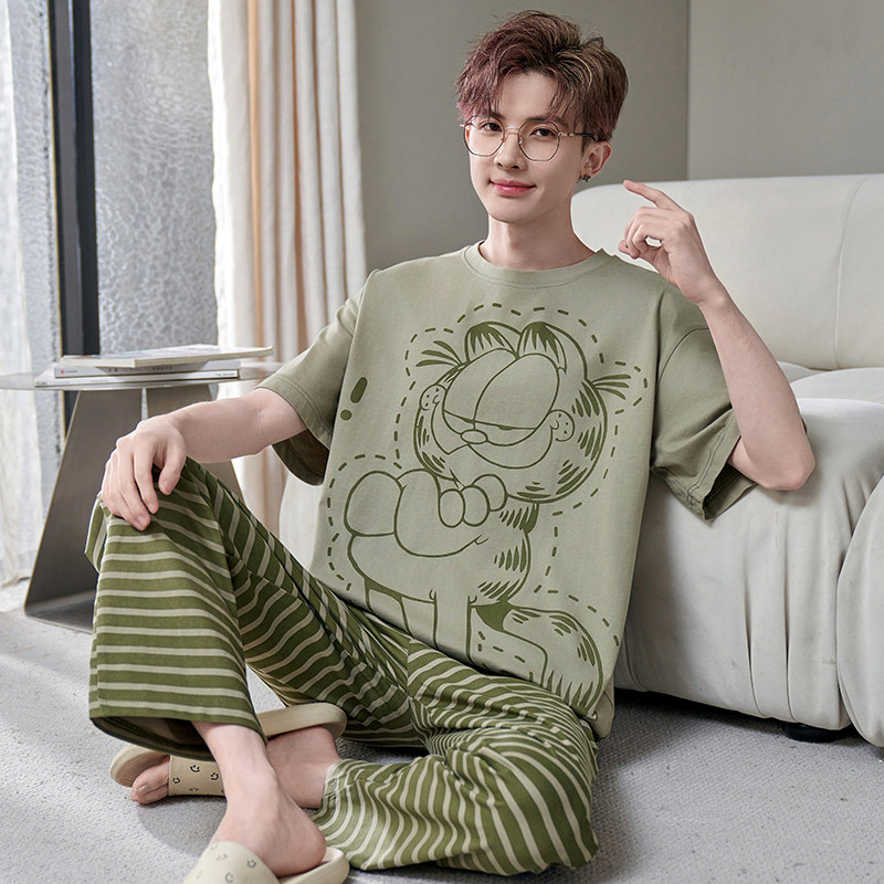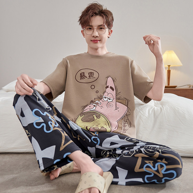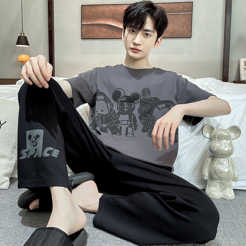 春季男士纯棉睡衣短袖长裤卡通青少年宽松加大码男孩家居服套装夏